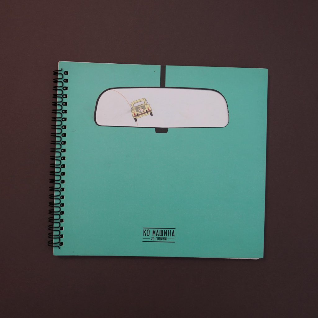 On the cover, a minimal vector drawing of the car is revealed through a cut-out shaped like a rear-view mirror — a simple look 20 years back.