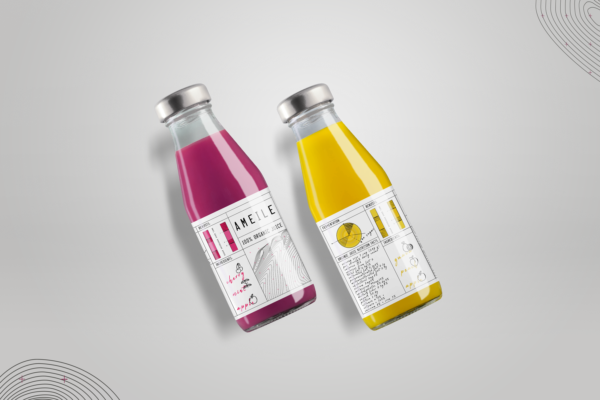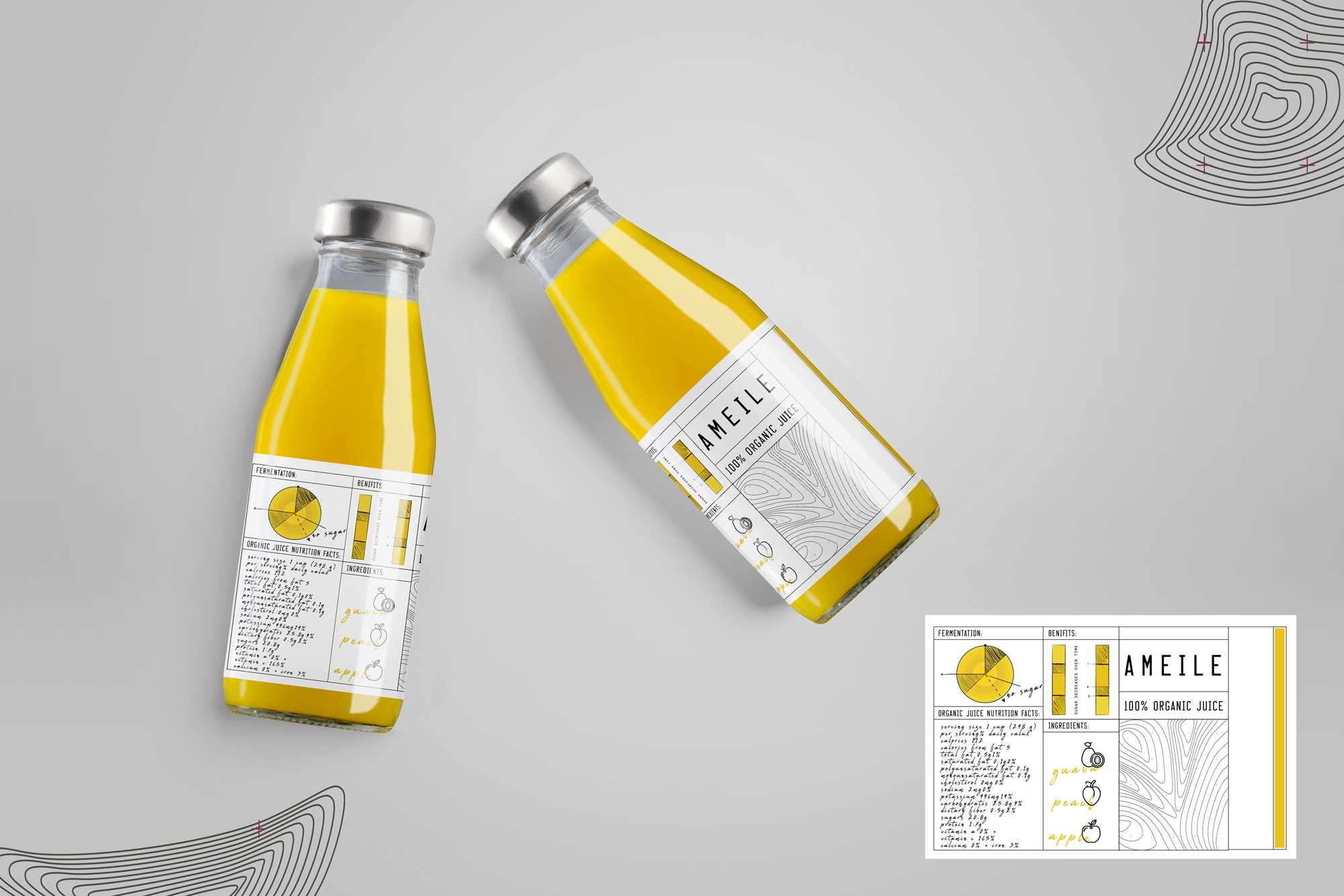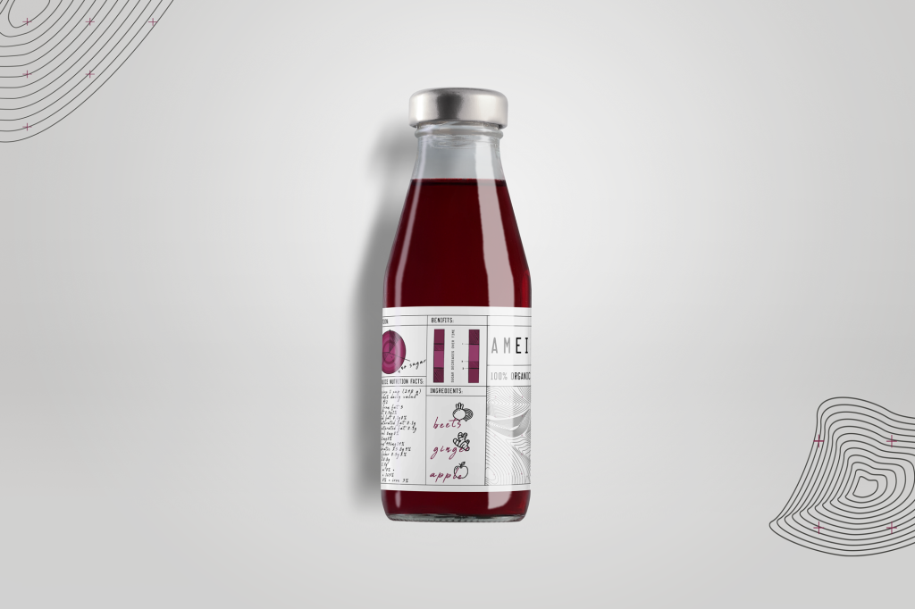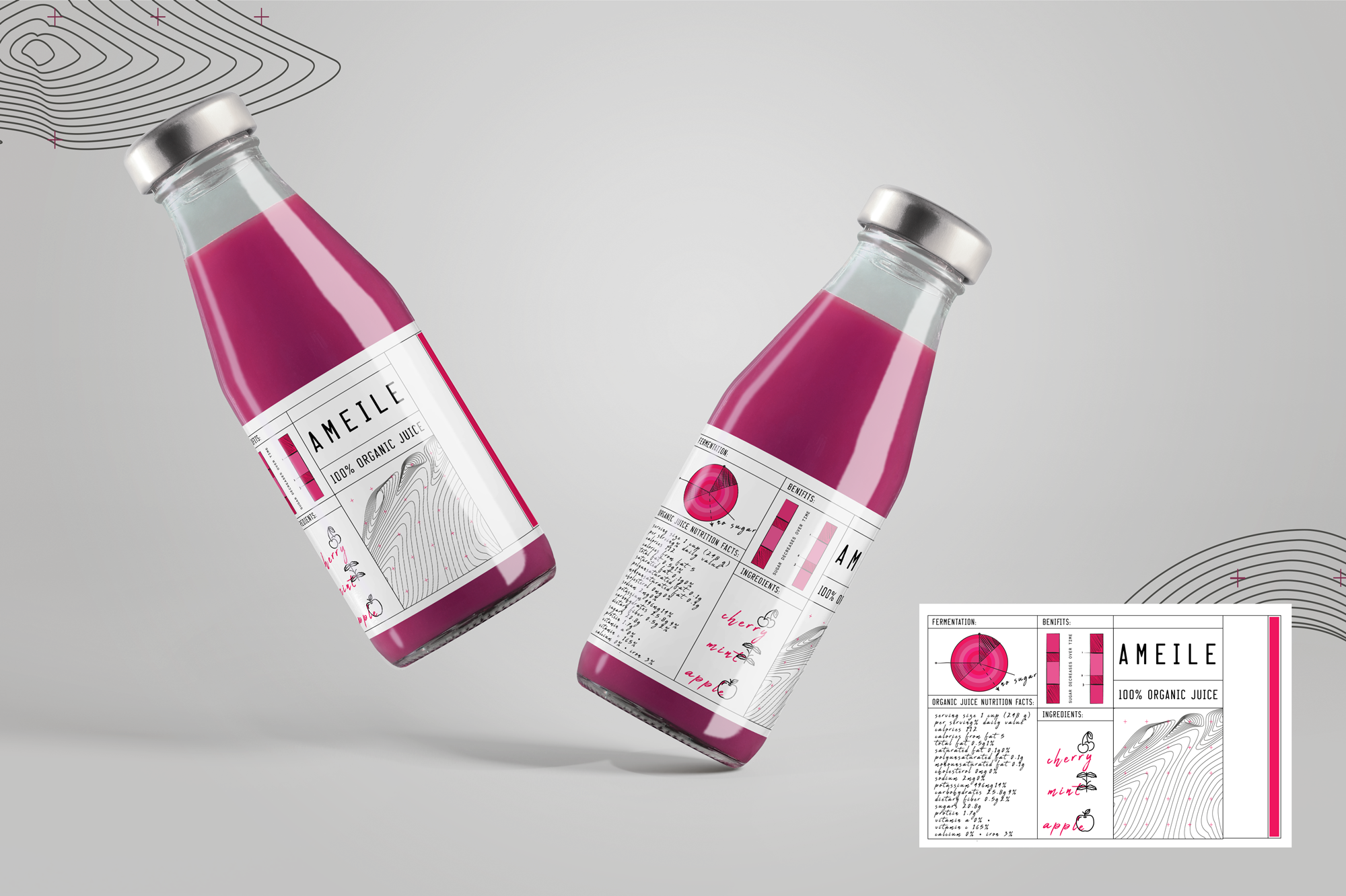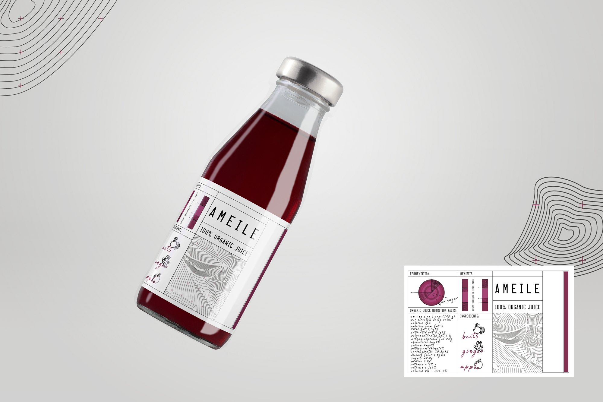 The label combines structured nutritional-data layouts with hand-drawn ingredient illustrations and tactile typographic elements. Technical grid systems meet organic forms, reflecting the balance between science-driven production and natural ingredients.