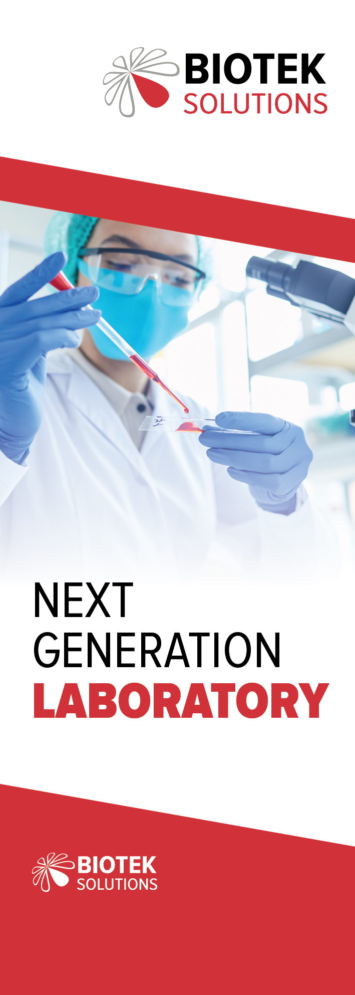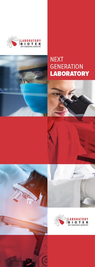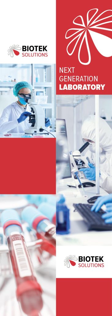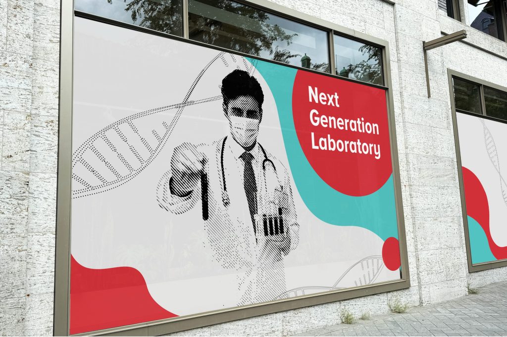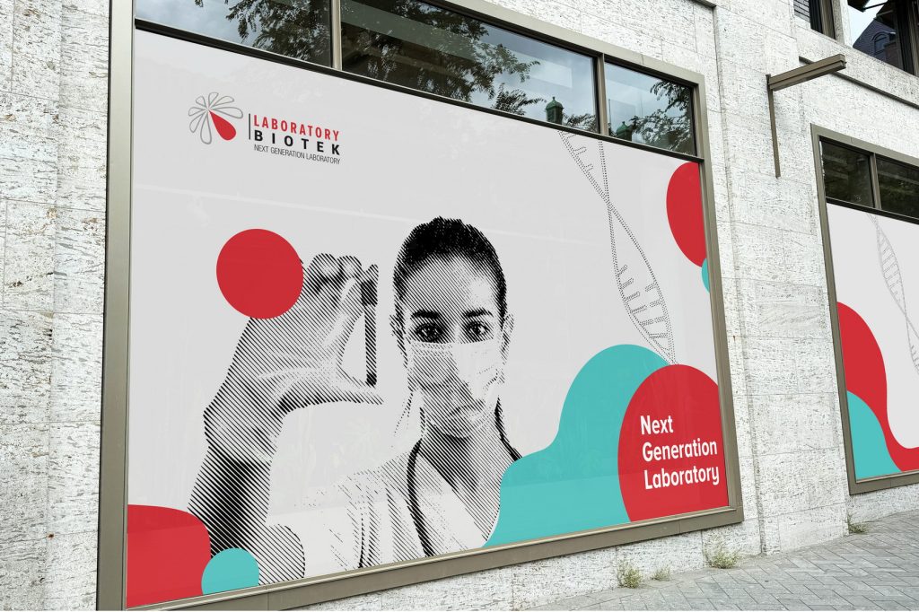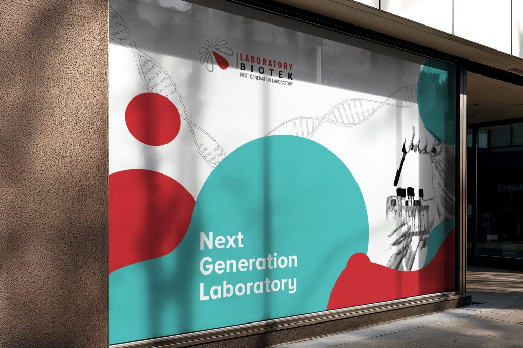 The system combined abstract organic forms derived from the Biotek logo, laboratory photography and a strong red-white color structure. Window graphics created a consistent façade across laboratory locations, while vertical billboards extended the identity into larger urban formats.