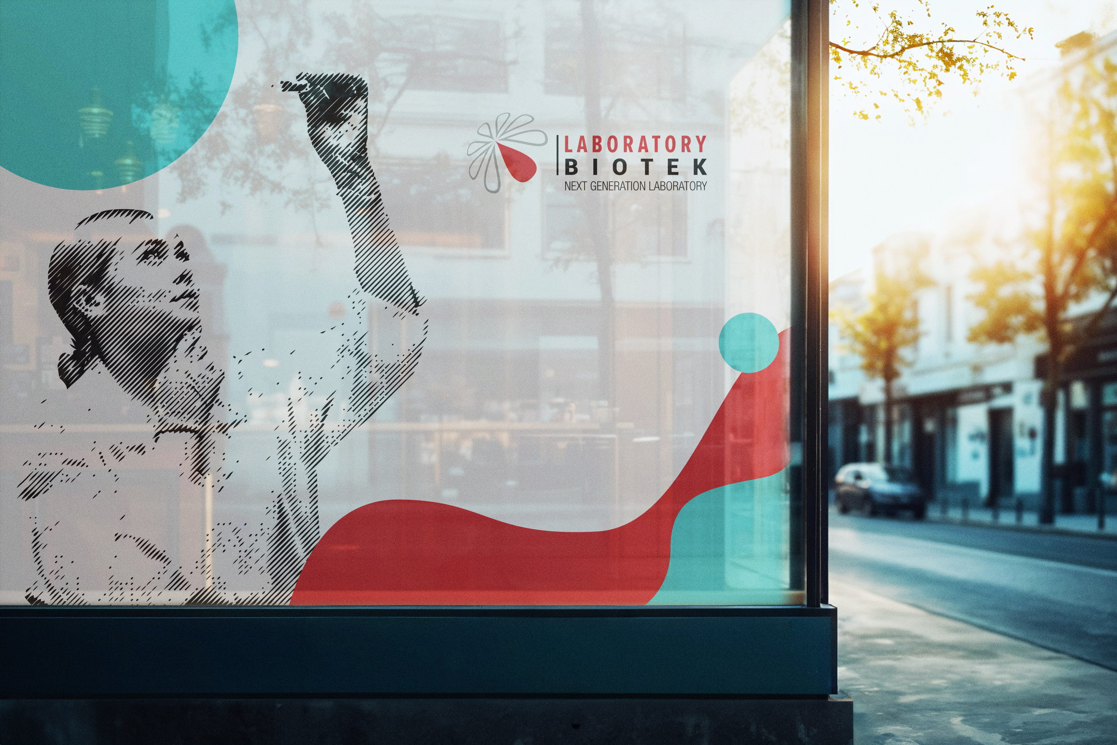 A visual branding system developed for Biotek laboratories, including large-scale window graphics for laboratory storefronts and a series of vertical building billboards designed to strengthen the brand’s visibility in the urban environment.