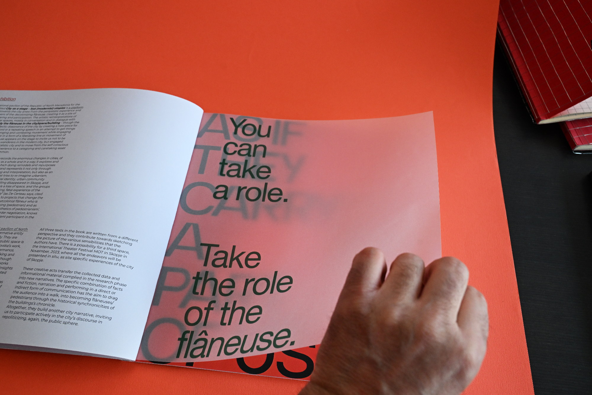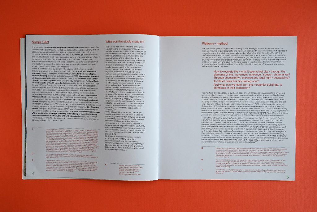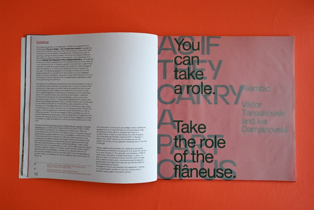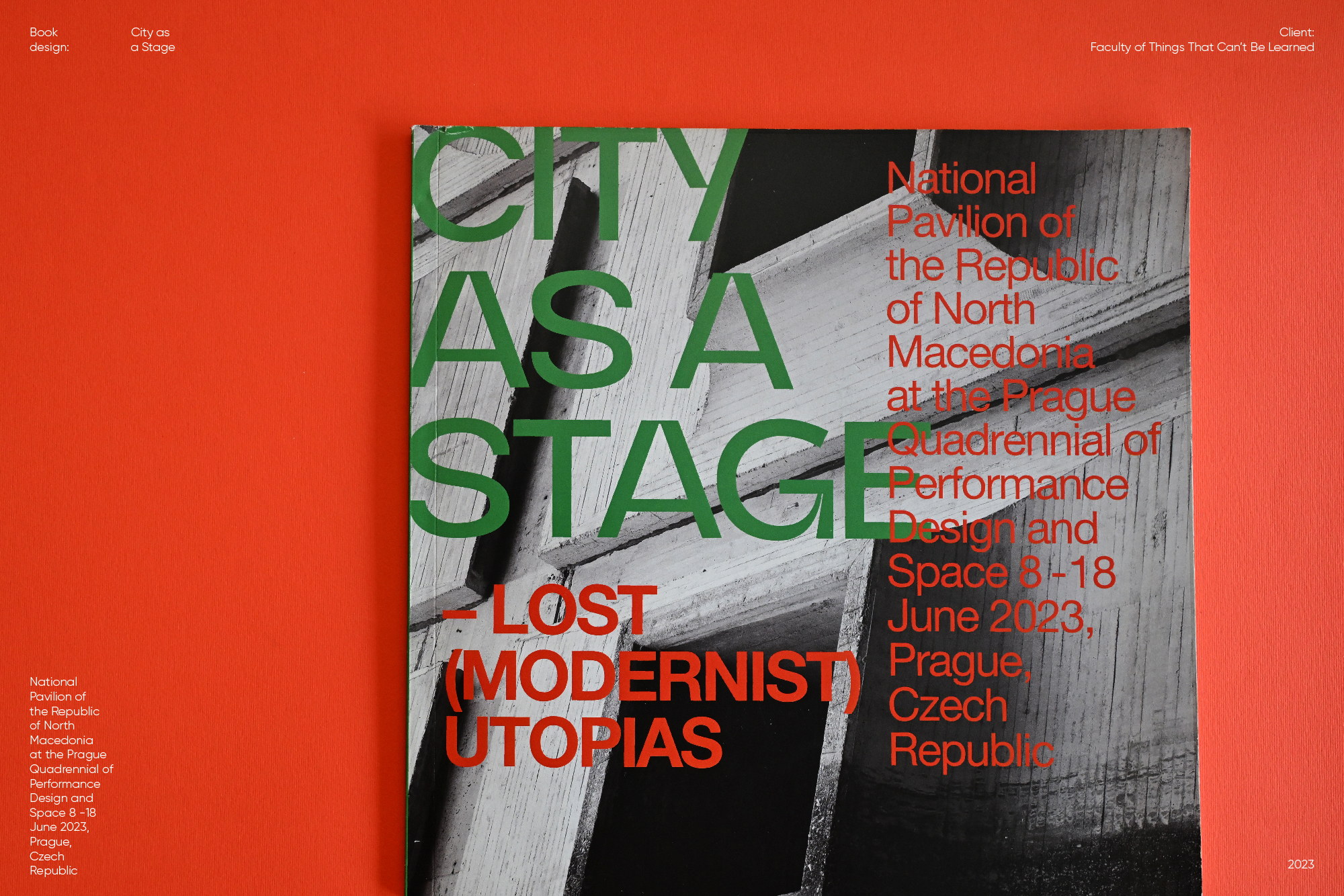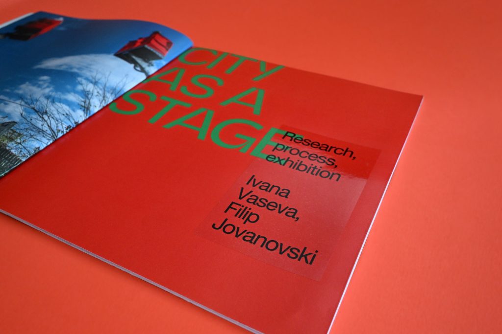 City as a Stage is a publication and visual identity created for the National Pavilion of North Macedonia at the Prague Quadrennial 2023. The concept sees the city as a performative space — shaped by architecture, movement and human presence. Bold typography behaves like urban structures, while a vivid green–red palette creates tension and visibility. Modernist architectural fragments act as scenography, framing the narrative of lost utopias. The identity extends beyond the book into posters, tote bags and spatial applications, turning communication into a living urban intervention.
