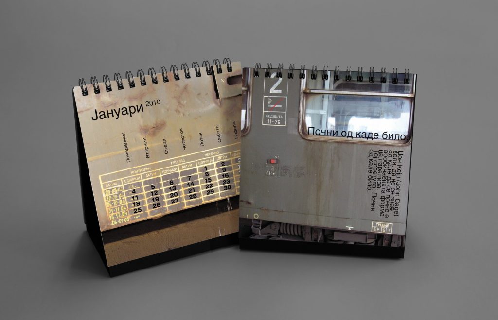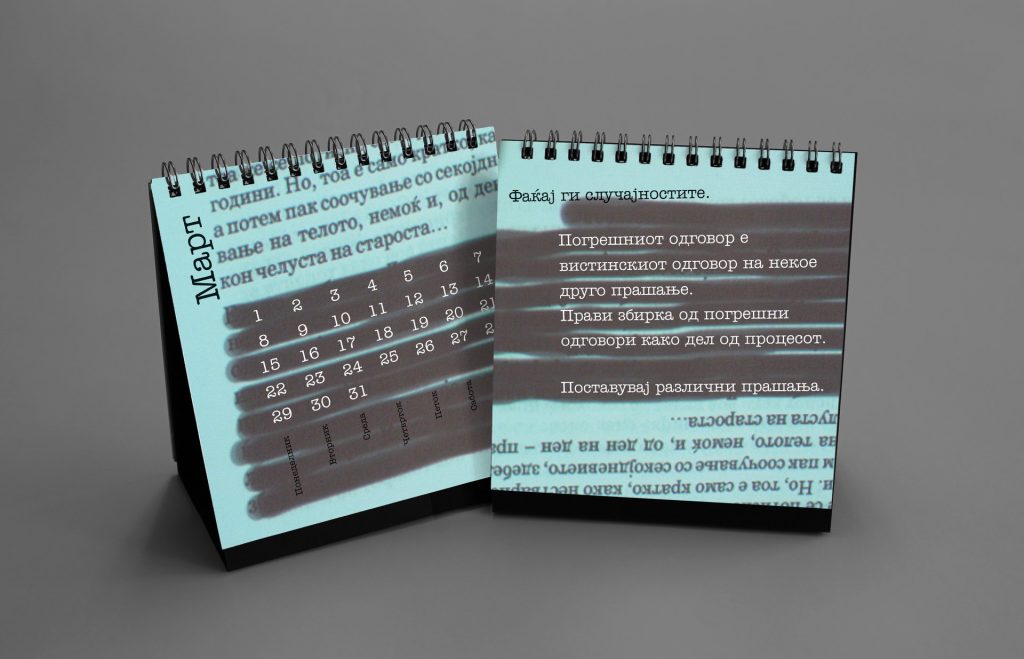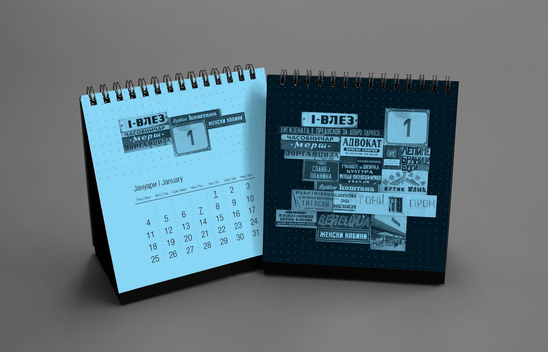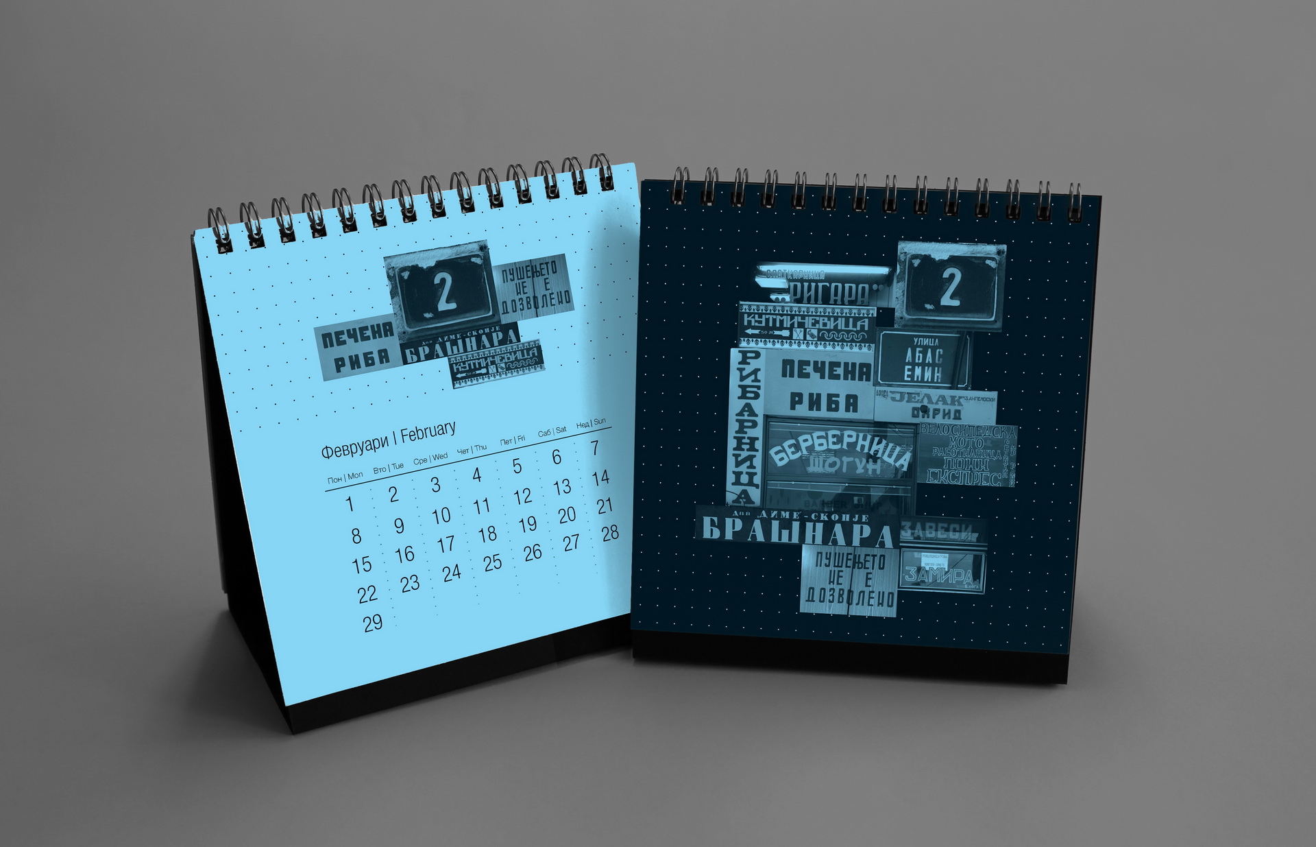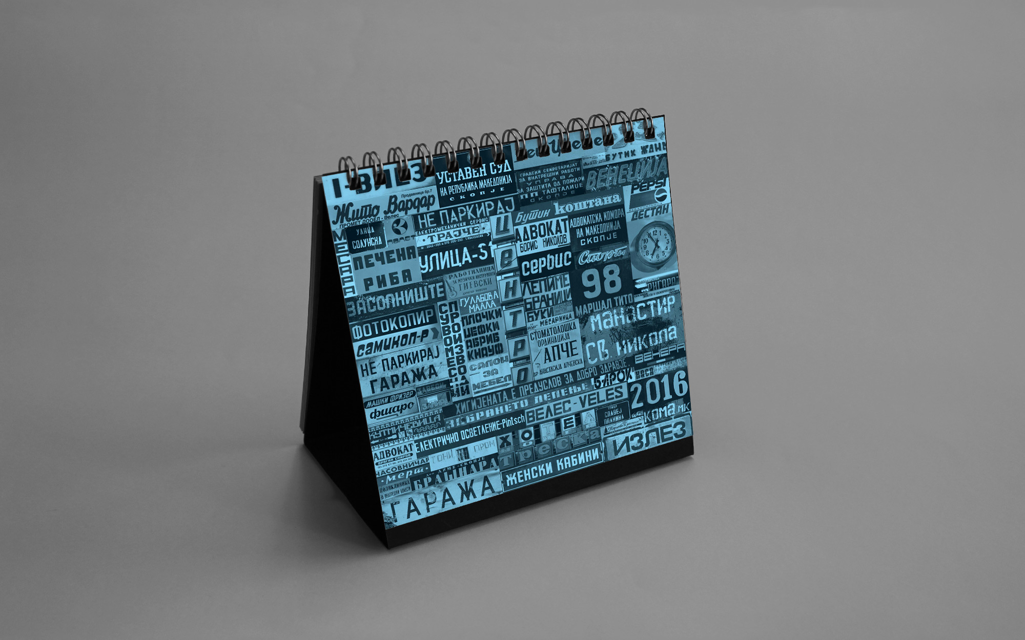 The 2016 calendar paid tribute to the anonymous typographers and sign painters who shaped the visual language of the city in past decades. The design assembled collages of photographed street signs, shopfront lettering, institutional plaques and directional boards collected across Macedonia. Rendered in a restrained duotone black-blue palette, the project celebrated the raw typography of everyday urban culture and preserved fragments of a disappearing visual heritage.