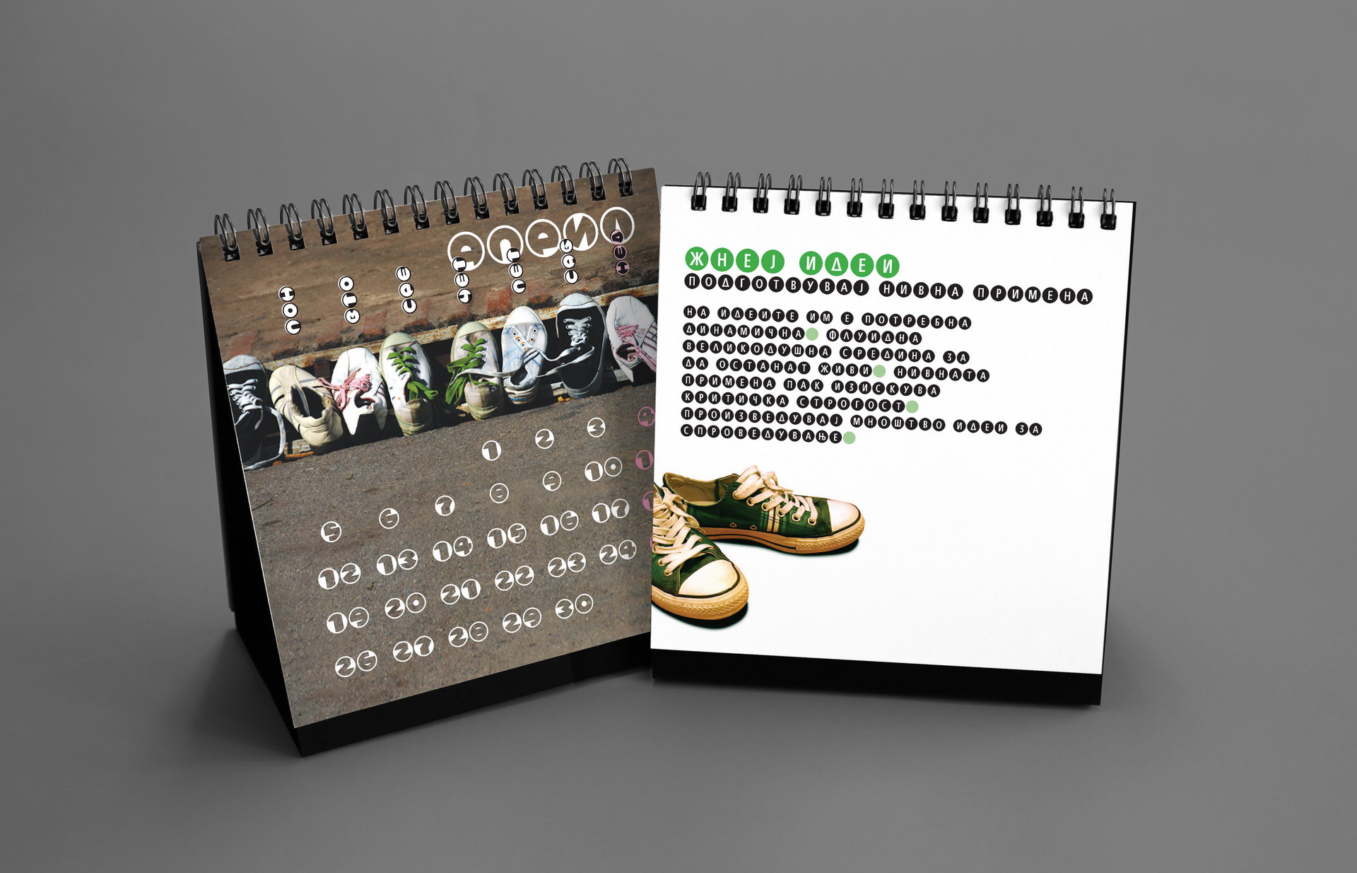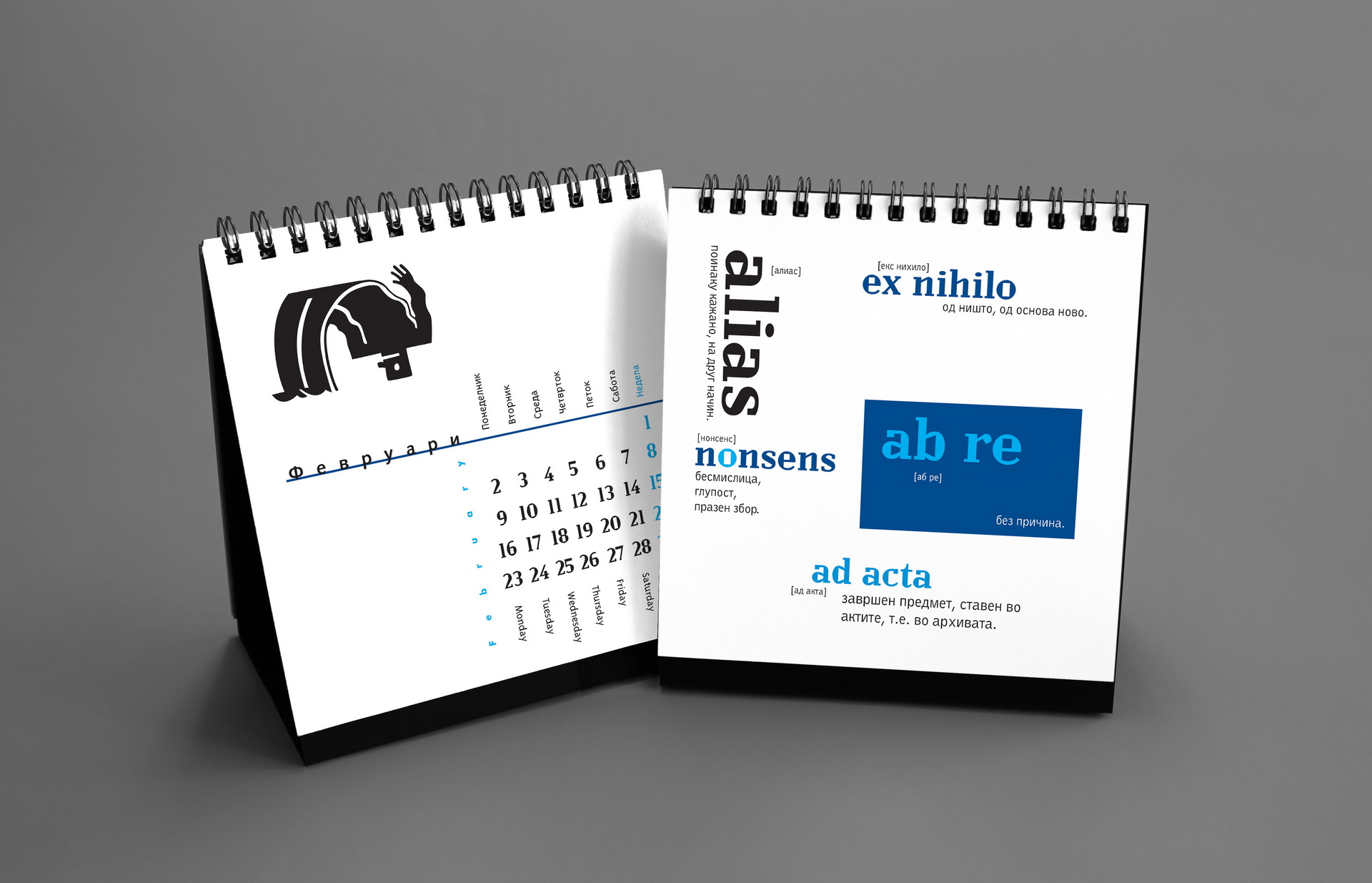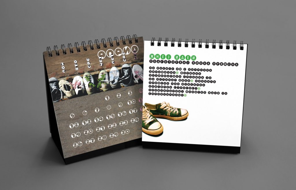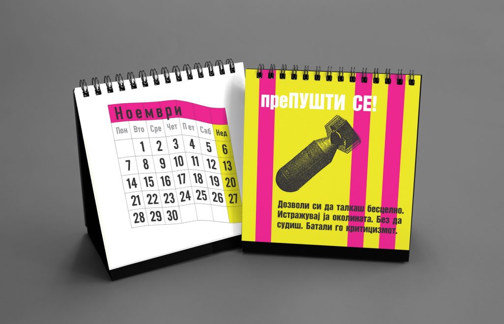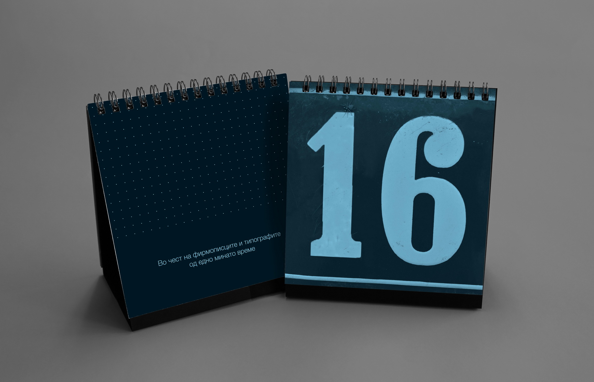 The 2016 calendar paid tribute to the anonymous typographers and sign painters who shaped the visual language of the city in past decades. The design assembled collages of photographed street signs, shopfront lettering, institutional plaques and directional boards collected across Macedonia. Rendered in a restrained duotone black-blue palette, the project celebrated the raw typography of everyday urban culture and preserved fragments of a disappearing visual heritage.