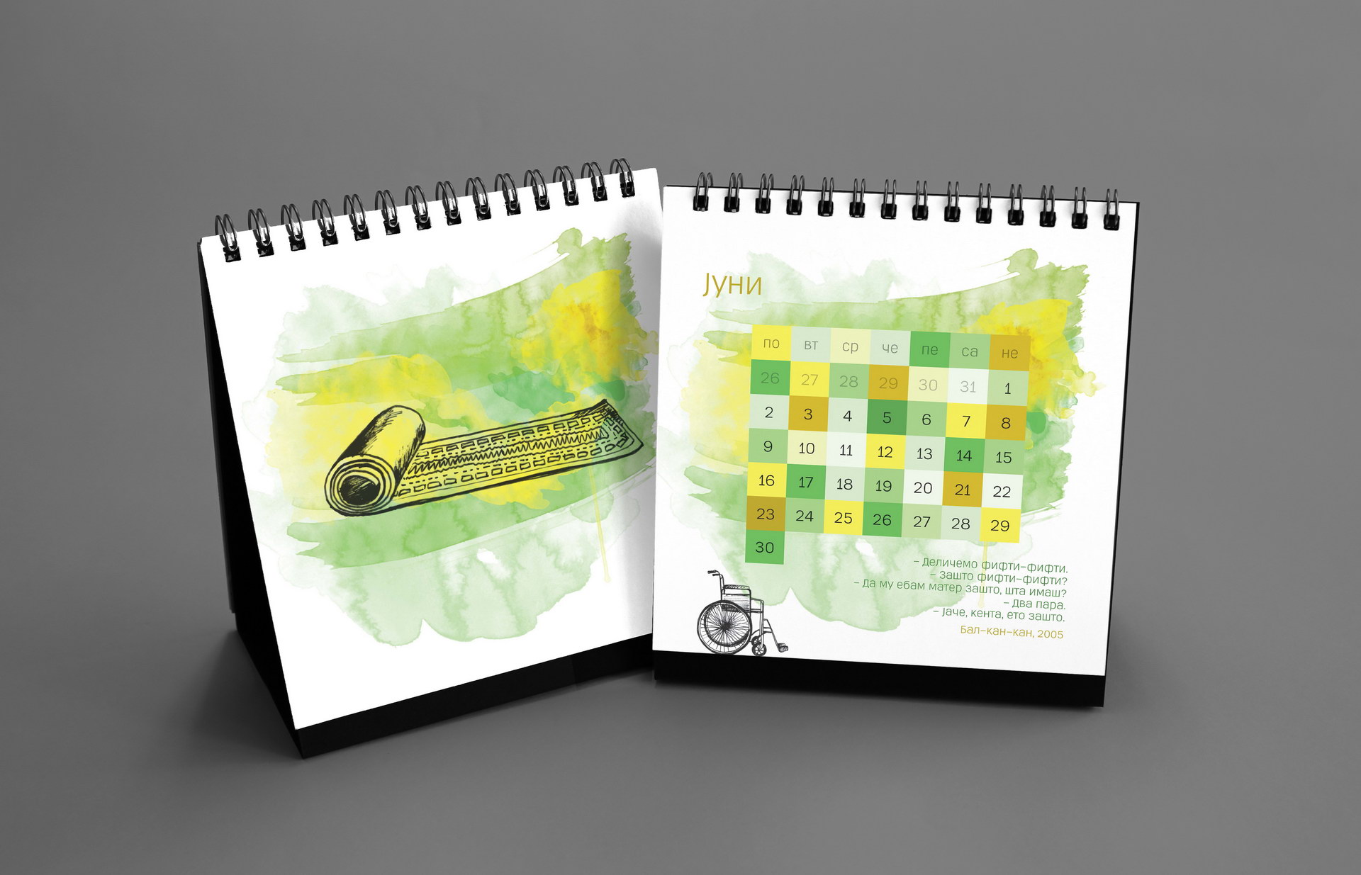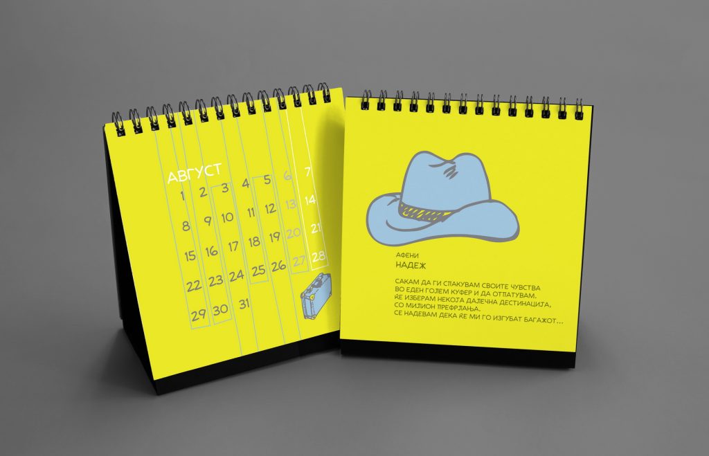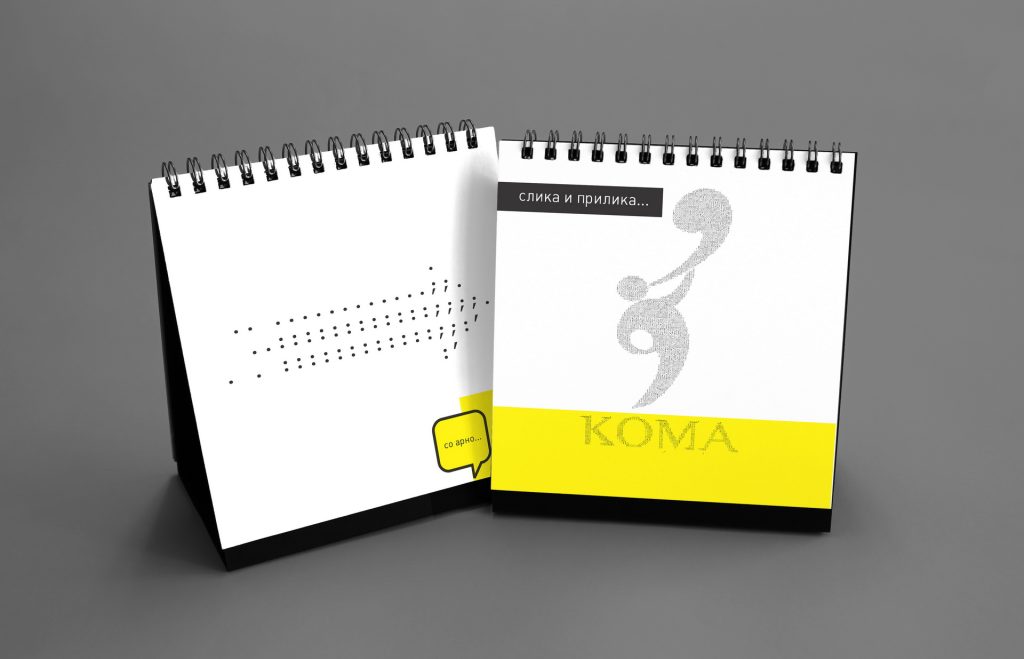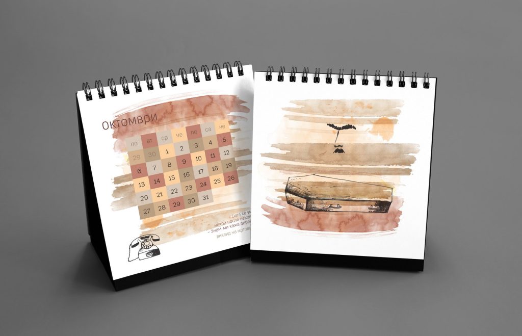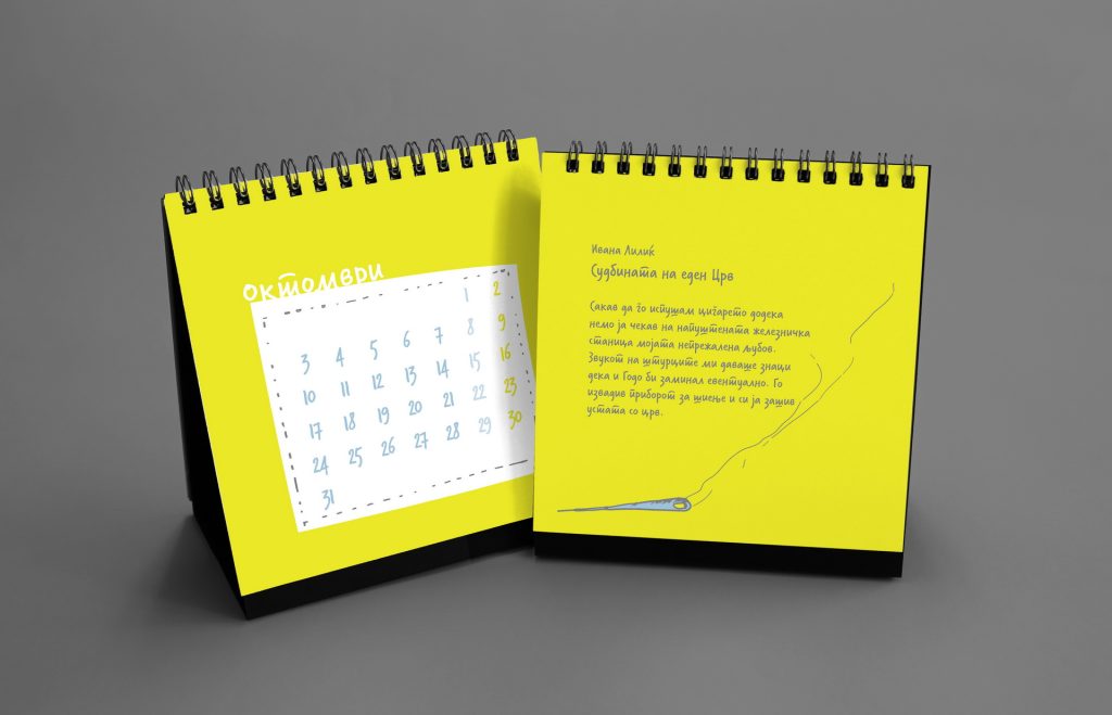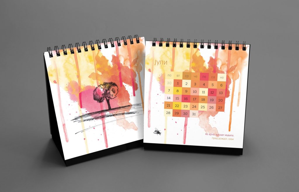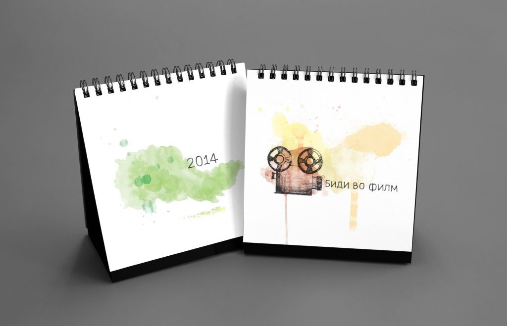 The 2014 edition celebrated memorable quotes from Macedonian films. The calendar combined hand-painted watercolor illustrations by Koma designers Marija Smilevska and Frosina Coneva with graphic design elements, creating a distinctive dialogue between cinema history, illustration and contemporary visual interpretation.