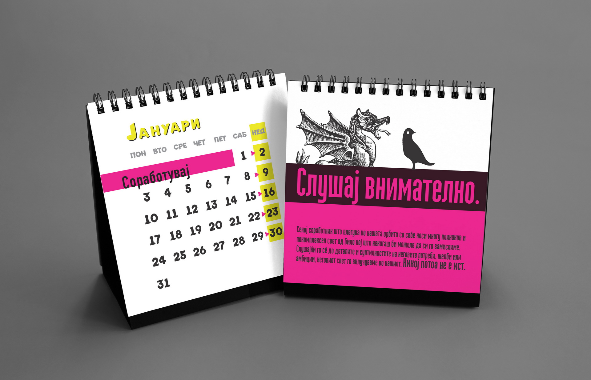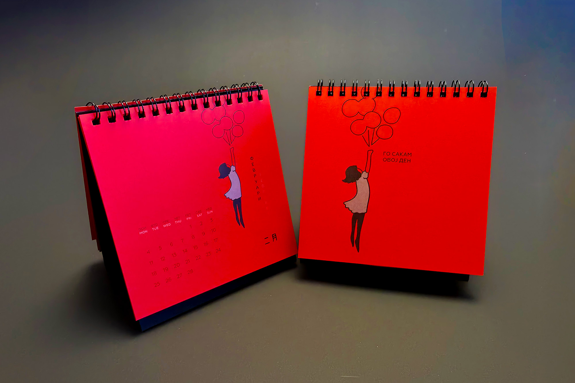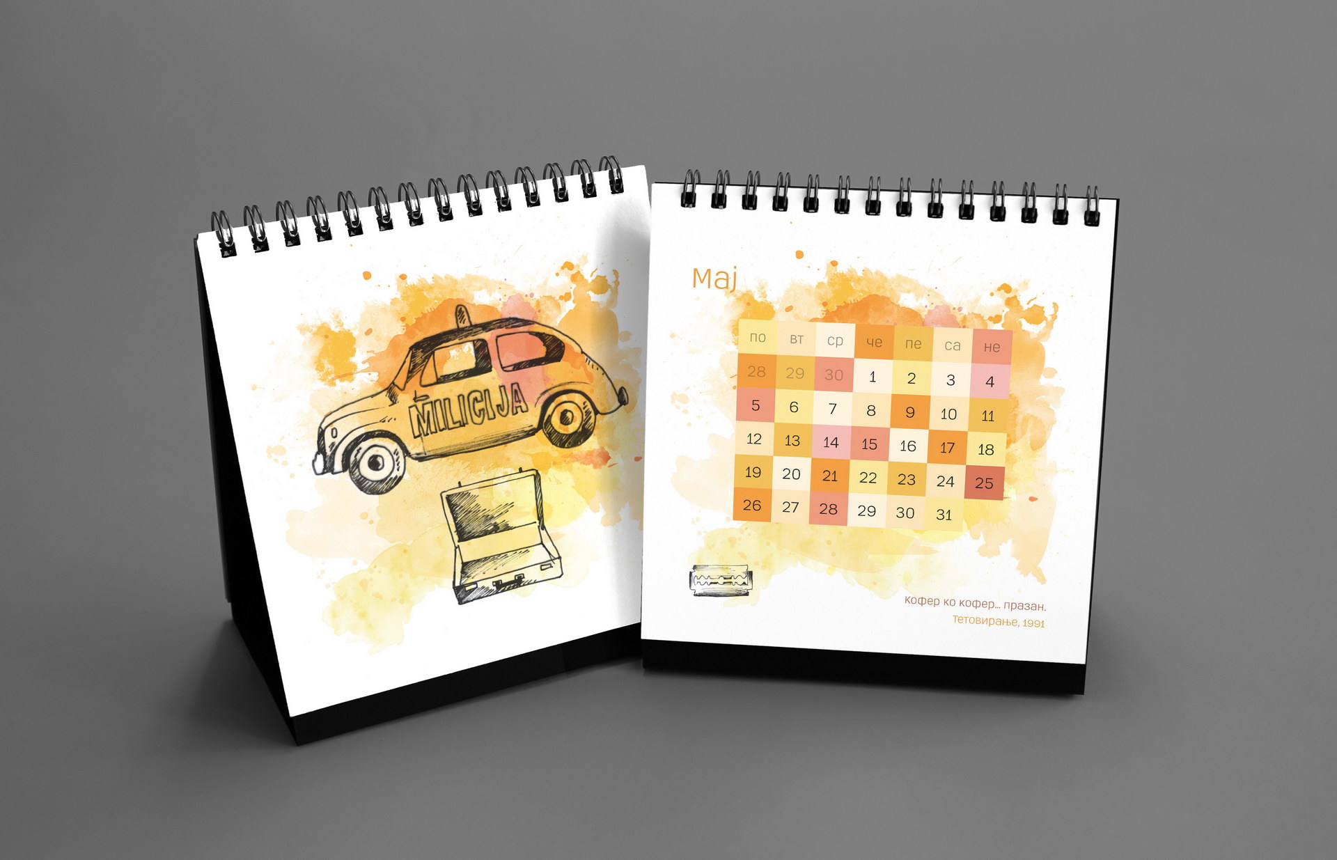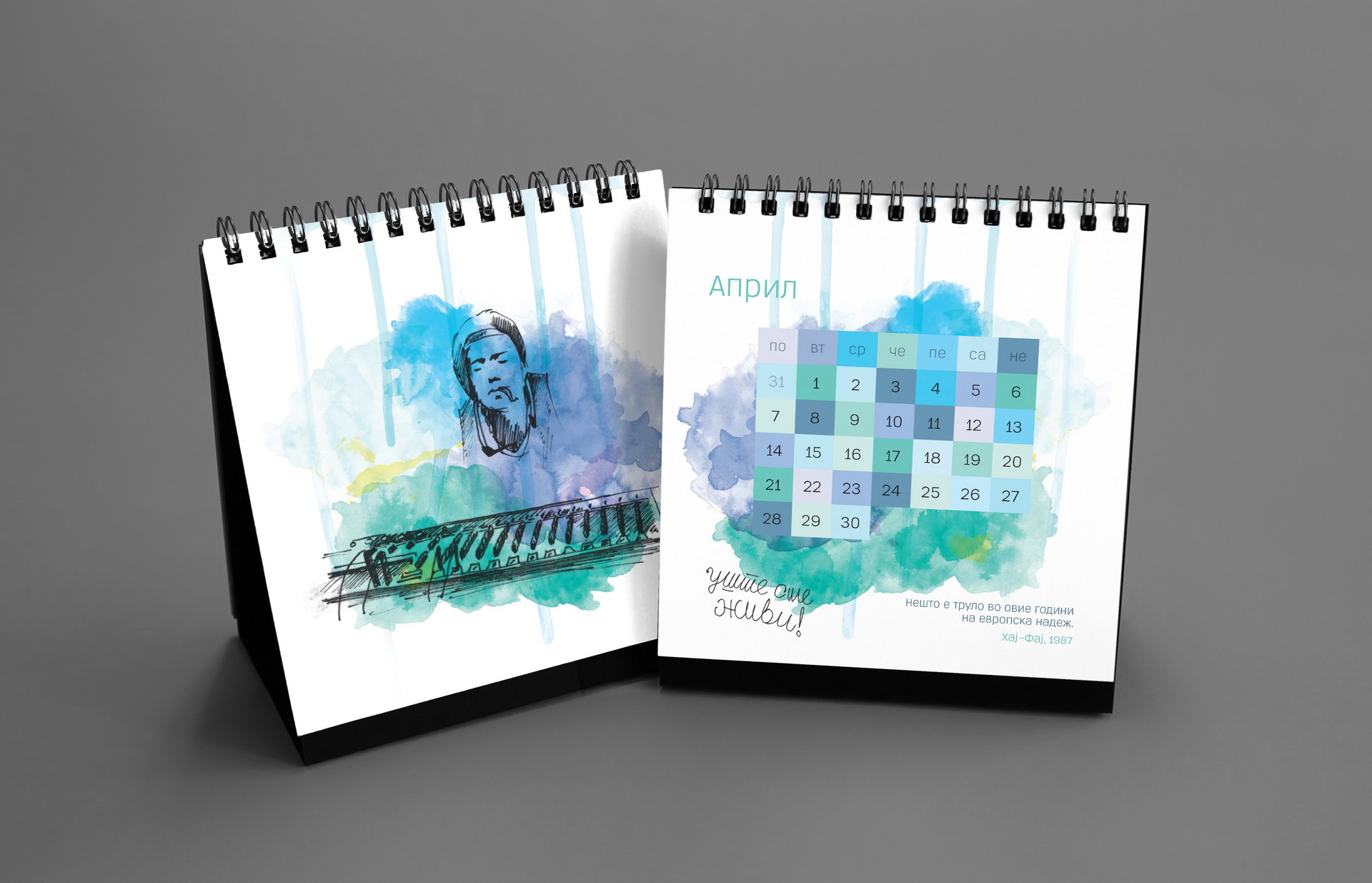 The 2014 edition celebrated memorable quotes from Macedonian films. The calendar combined hand-painted watercolor illustrations by Koma designers Marija Smilevska and Frosina Coneva with graphic design elements, creating a distinctive dialogue between cinema history, illustration and contemporary visual interpretation.