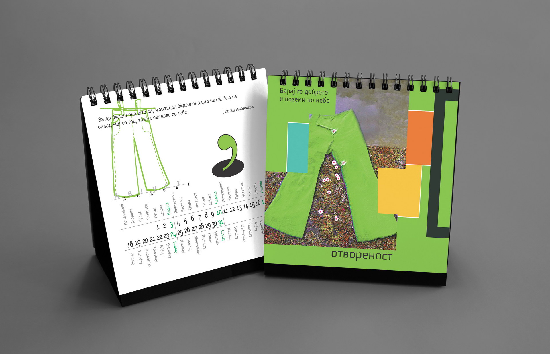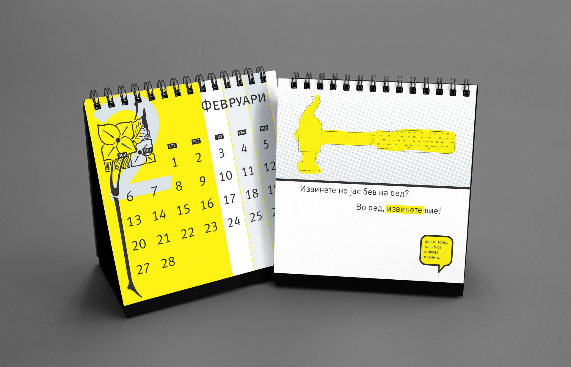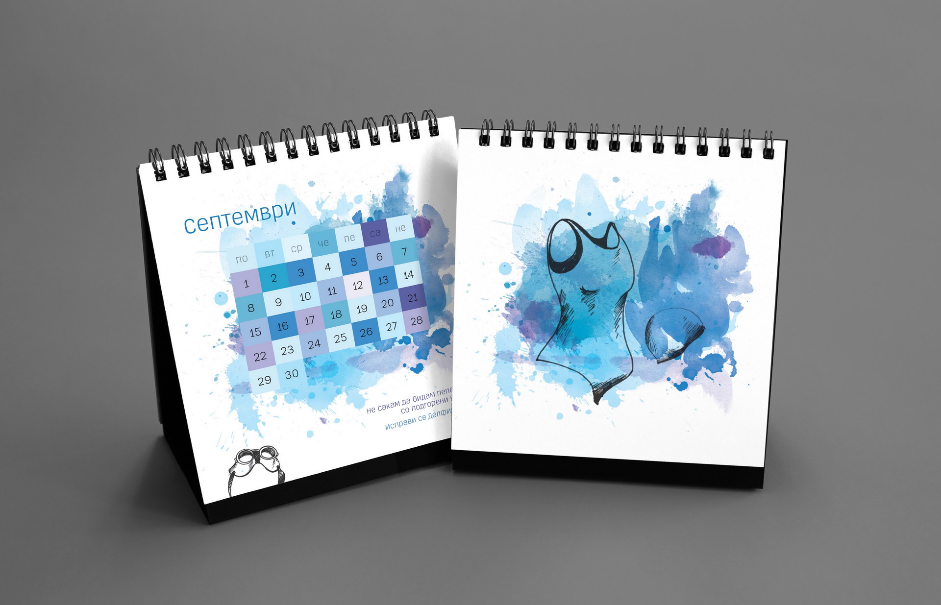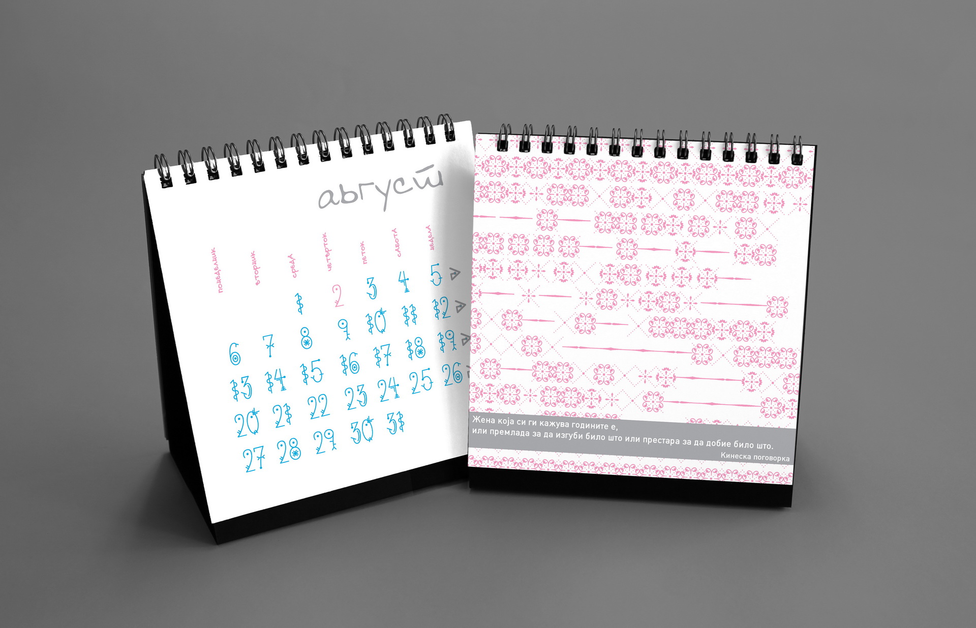 The 2014 edition celebrated memorable quotes from Macedonian films. The calendar combined hand-painted watercolor illustrations by Koma designers Marija Smilevska and Frosina Coneva with graphic design elements, creating a distinctive dialogue between cinema history, illustration and contemporary visual interpretation.
