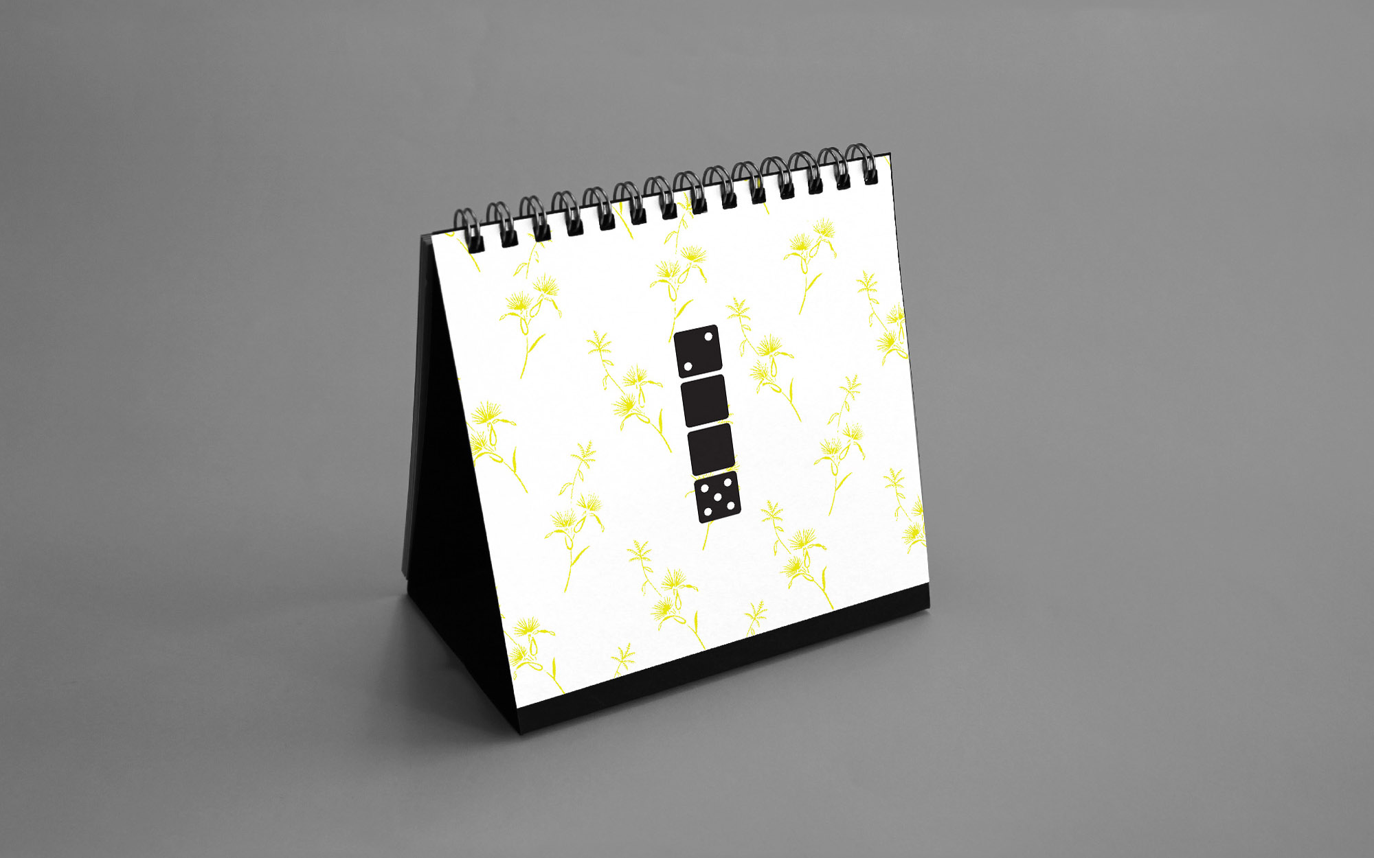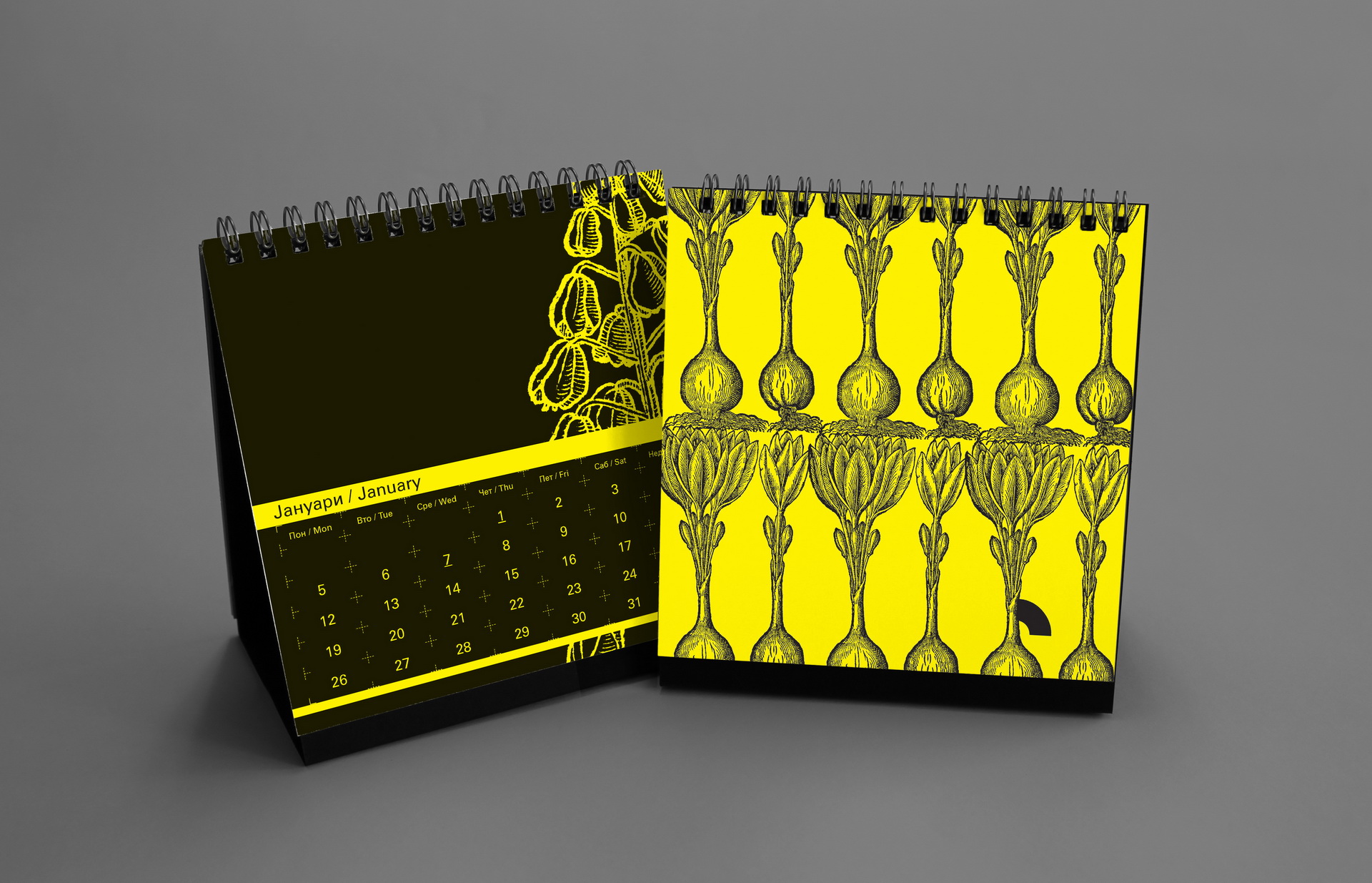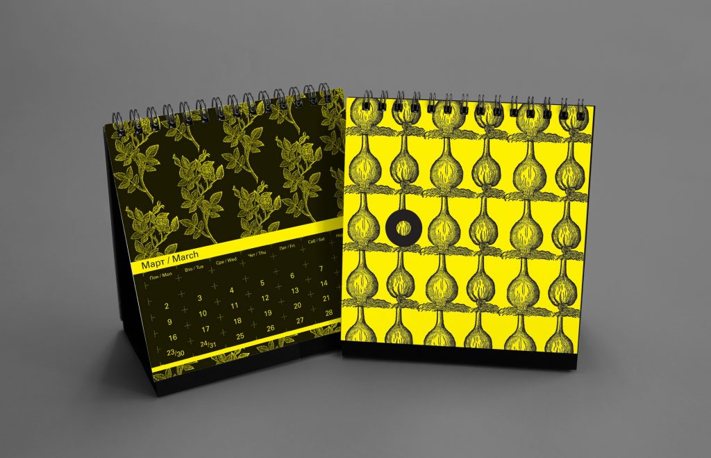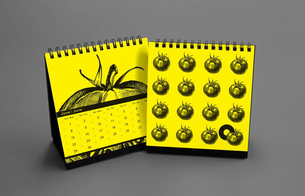 The 2015 edition explored a graphic dialogue between engraved botanical illustrations and sharp geometric vector forms. Vegetables and floral elements were paired with circular motifs and segmented shapes suggesting the passage of time through visual “quarters.” The calendar was printed in a striking black-on-yellow palette, using yellow stock paper and a single black ink to achieve a bold, high-contrast result.