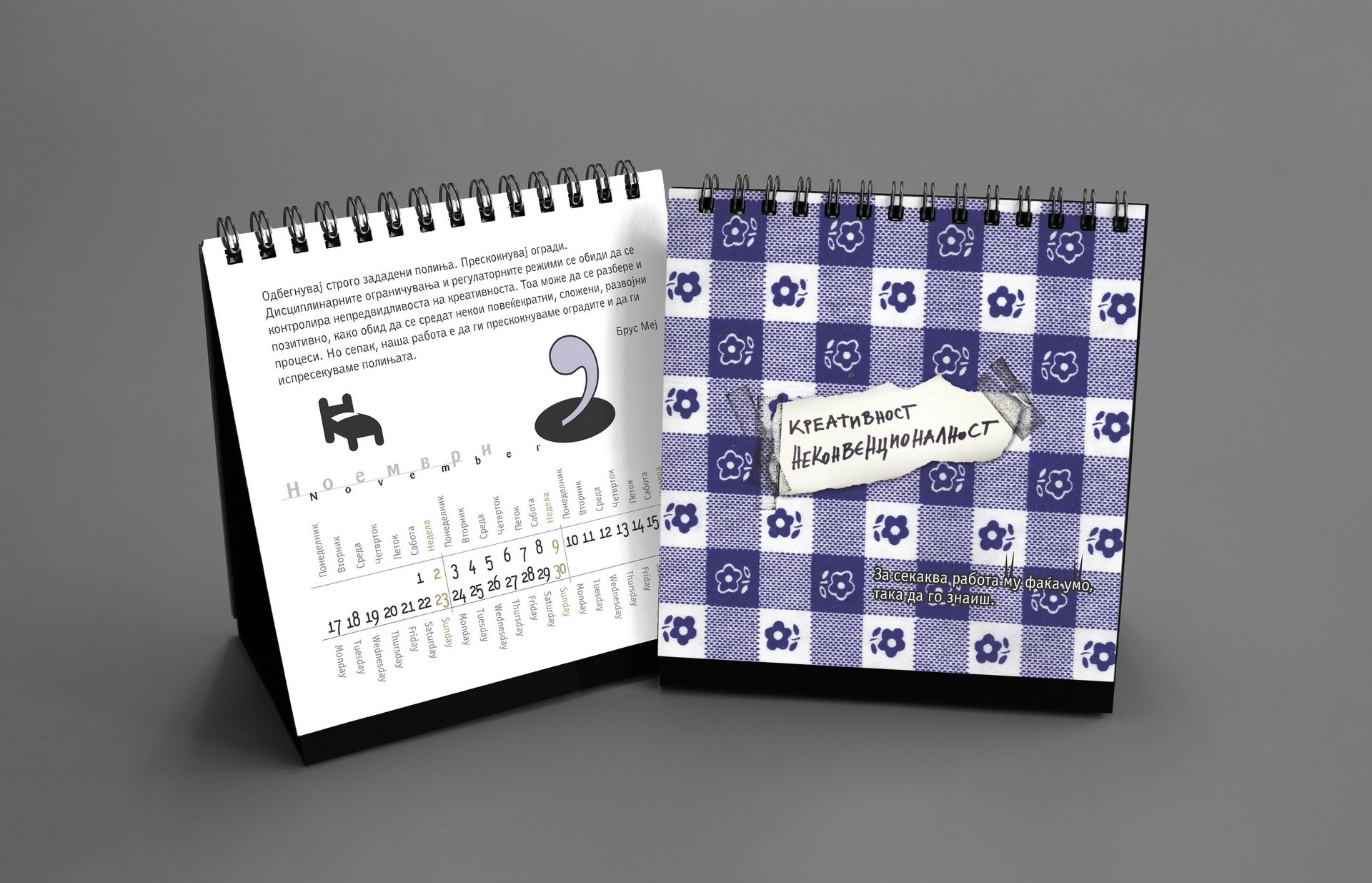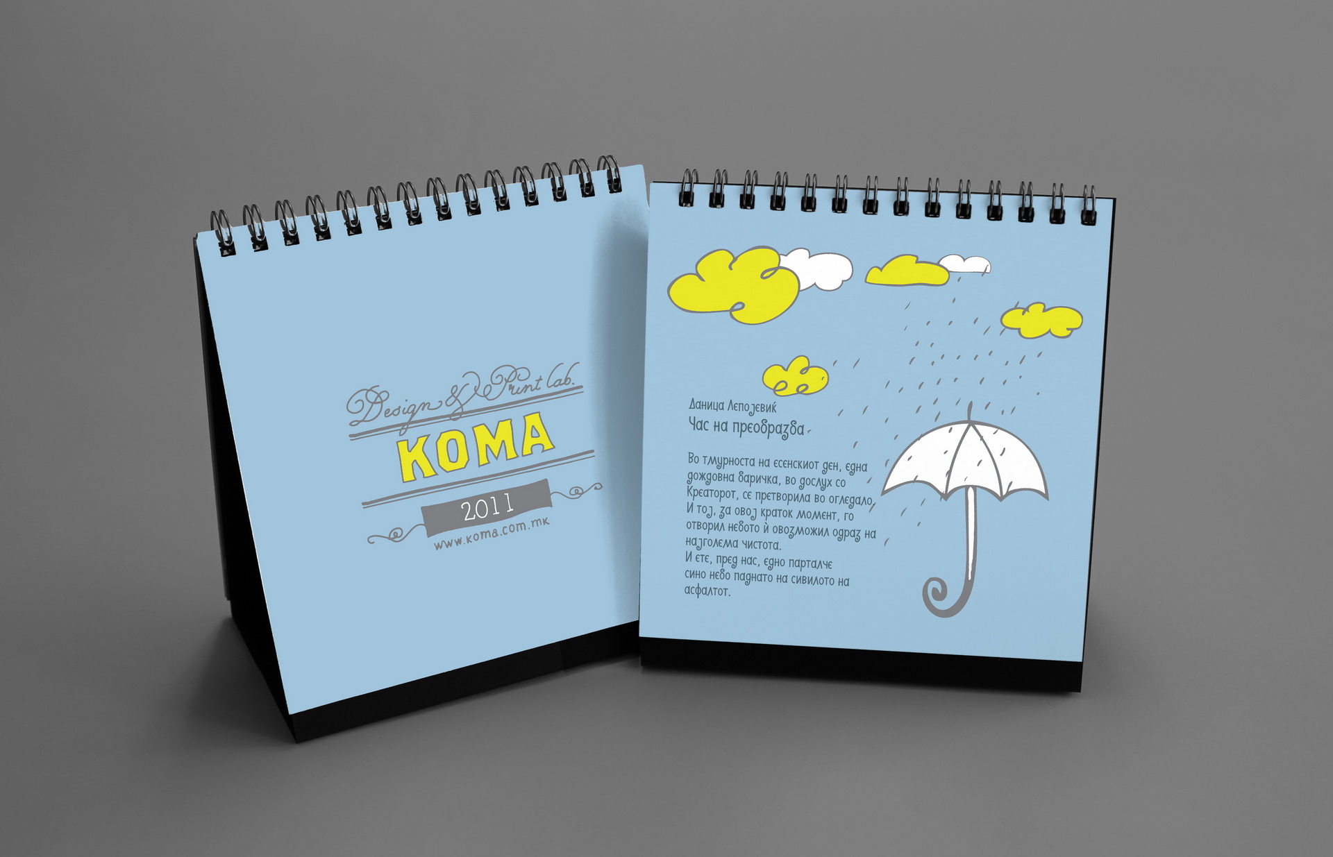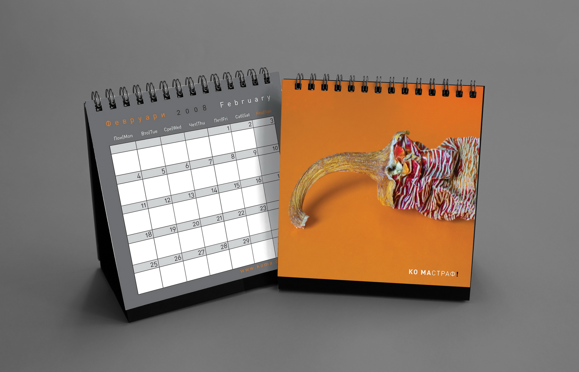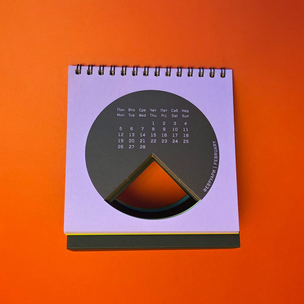 Created to mark 15 years of KOMA Design Studio, this edition played with the double meaning of the studio name as both identity and mechanism. The concept revolved around twelve wordplays derived from “KO MA”, forming a system of playful linguistic constructs. The calendar featured a minimalist geometric calendarium paired with strong photographic compositions, balancing precision and expressive visual storytelling.