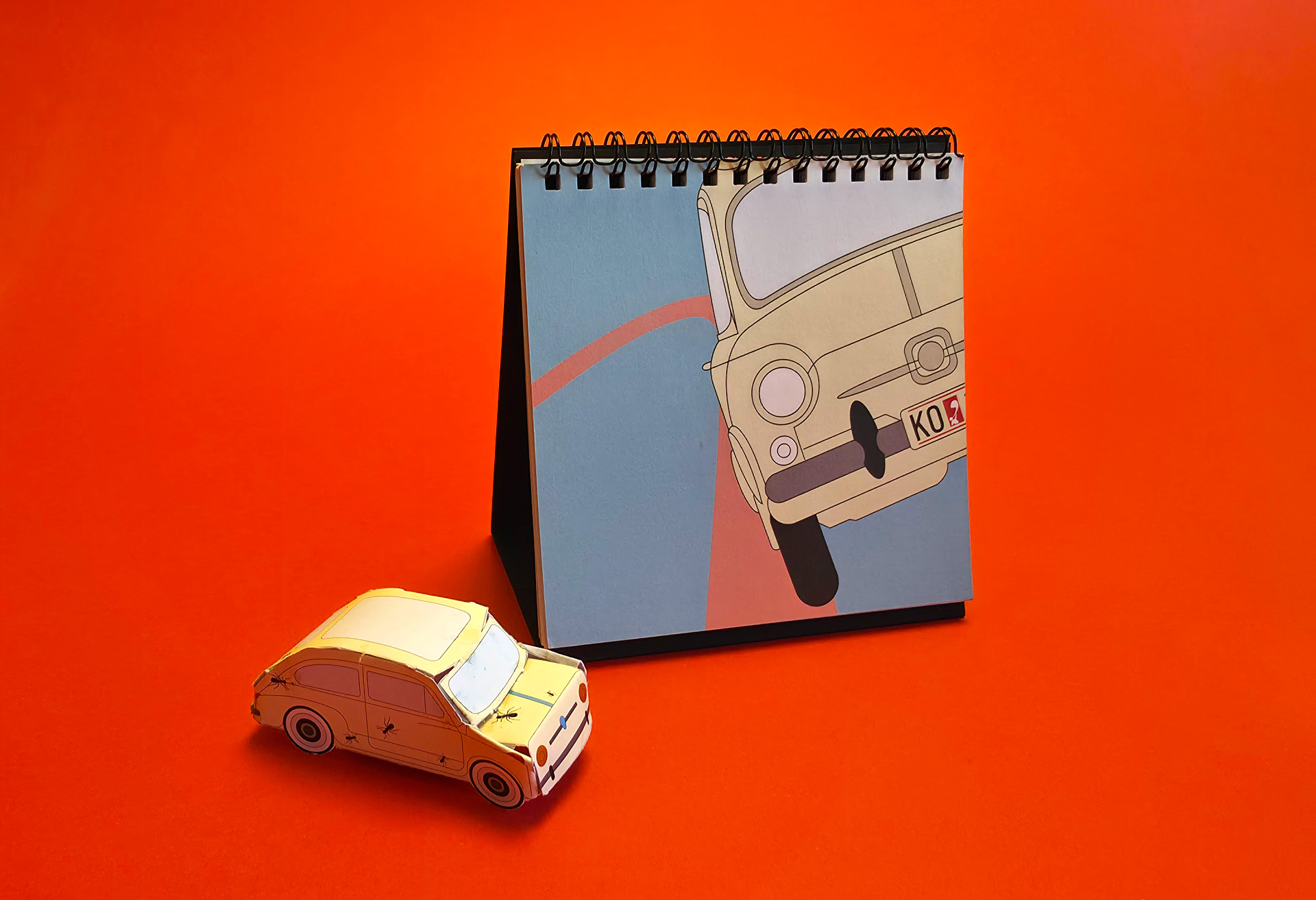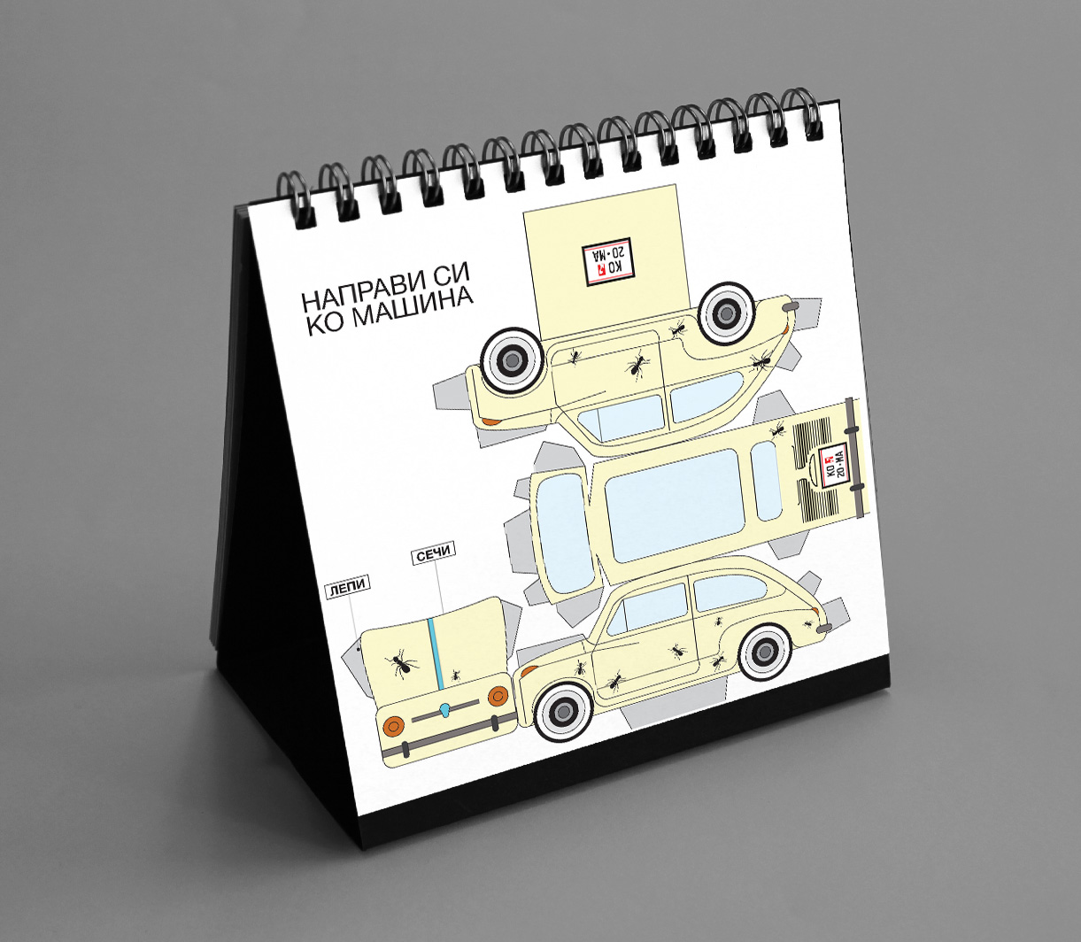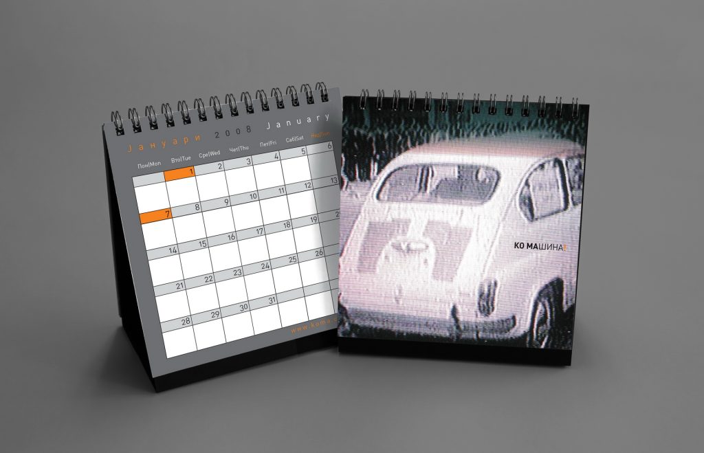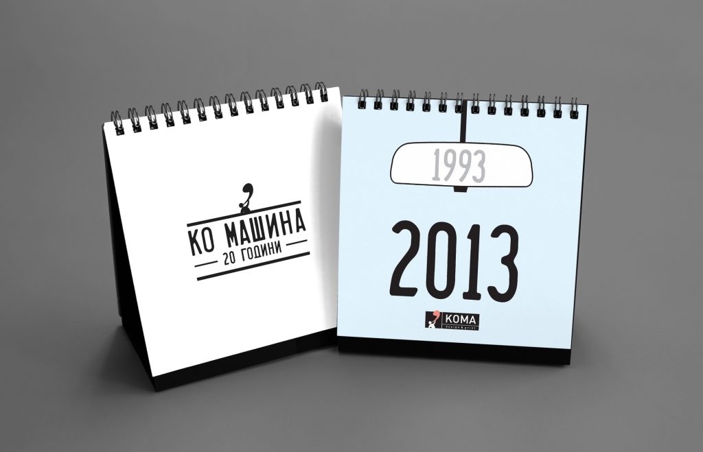 Marking 20 years of KOMA Design Studio, the 2013 edition revisited the playful KO MA wordplay system introduced earlier, generating a new set of twelve linguistic variations derived from the studio name. The visual narrative revolved around the studio’s first car from 1993 — a white Zastava 750 (“Ficho”) — used as a nostalgic motif throughout the calendar. The edition concluded with a printed paper model of the iconic car, allowing users to cut, assemble and build it into a small three-dimensional object.
