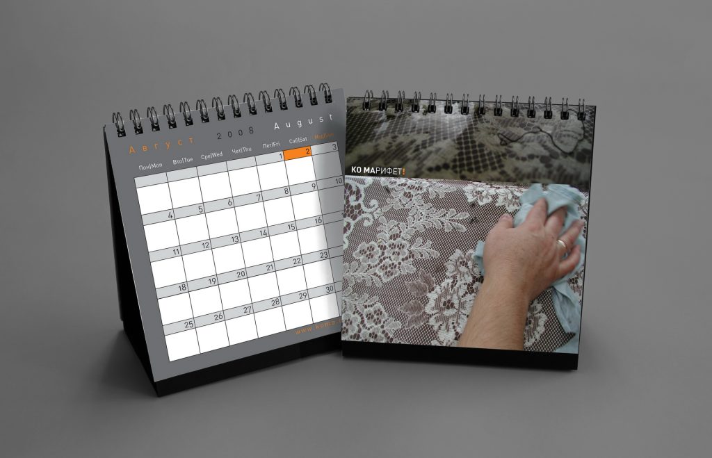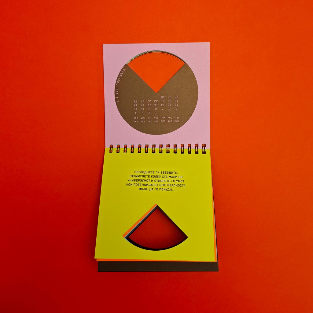 The 2012 edition featured paintings from the New Religion series by Koma designer and artist Marija Smilevska. The calendarium was integrated with the artworks through unconventional layouts and collage-like compositions, creating a dialogue between structured timekeeping and expressive visual art.