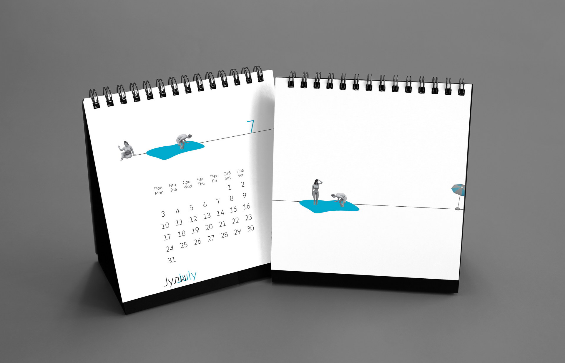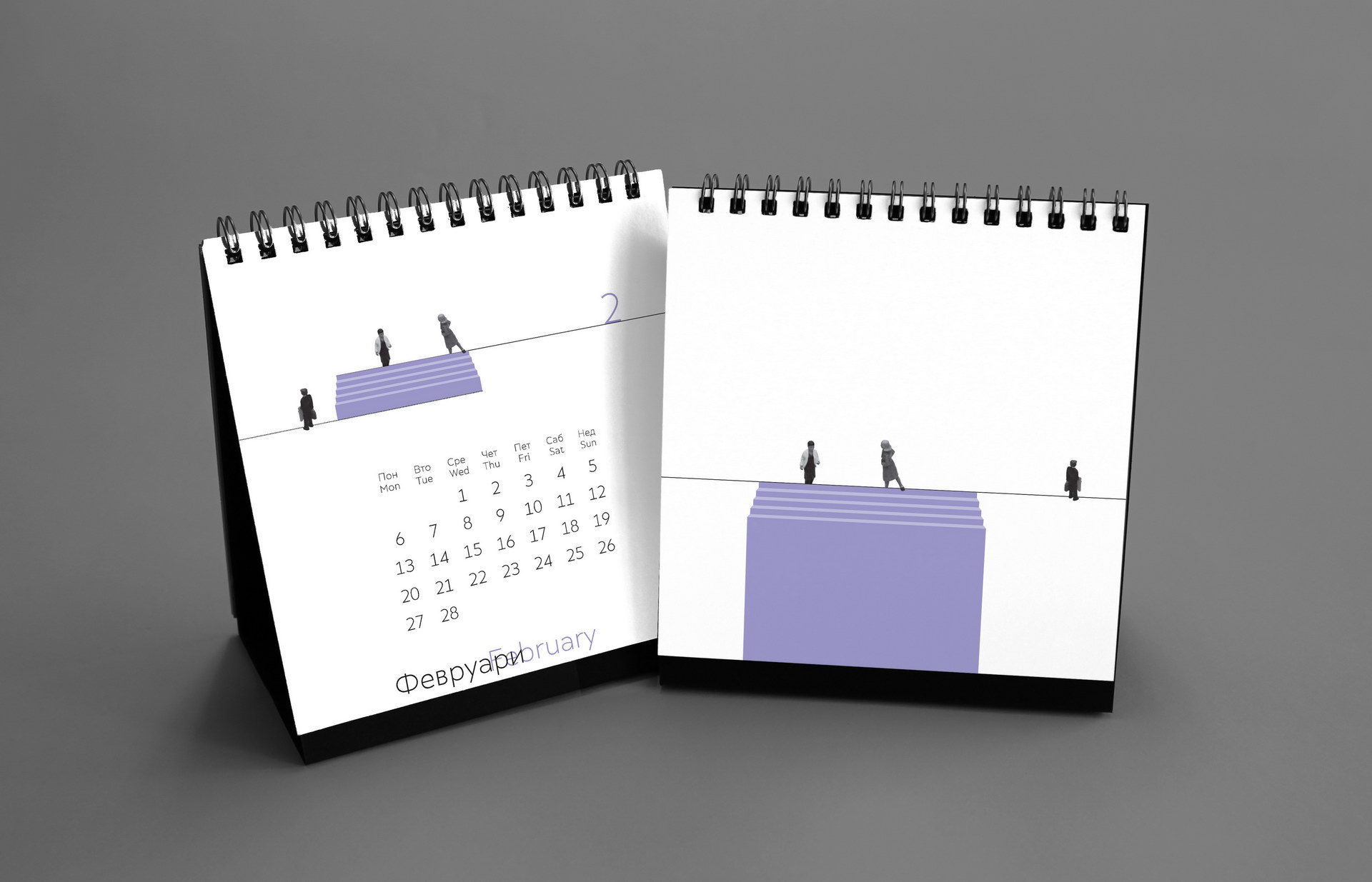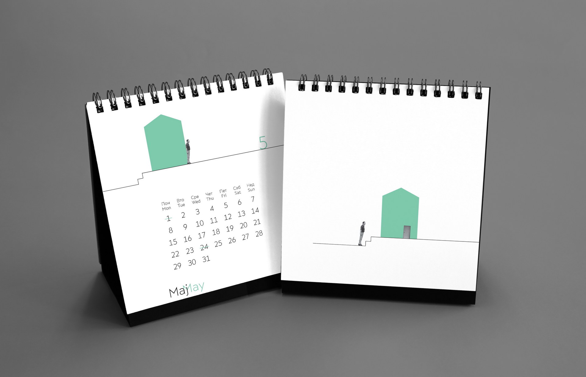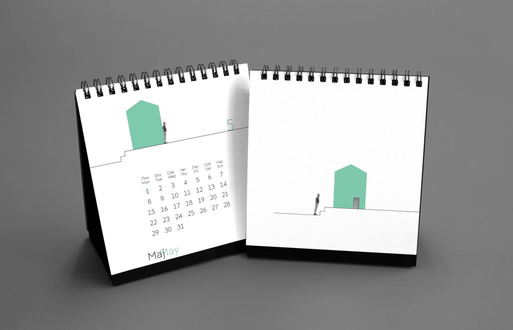 The 2017 calendar shifted towards a purely graphic language. Minimal geometric compositions were combined with tiny human figures to create subtle visual narratives about scale, perspective and everyday observation. Clean layouts, restrained color accents and precise typographic structure produced a quiet, conceptual calendar where small interventions generated playful spatial illusions.