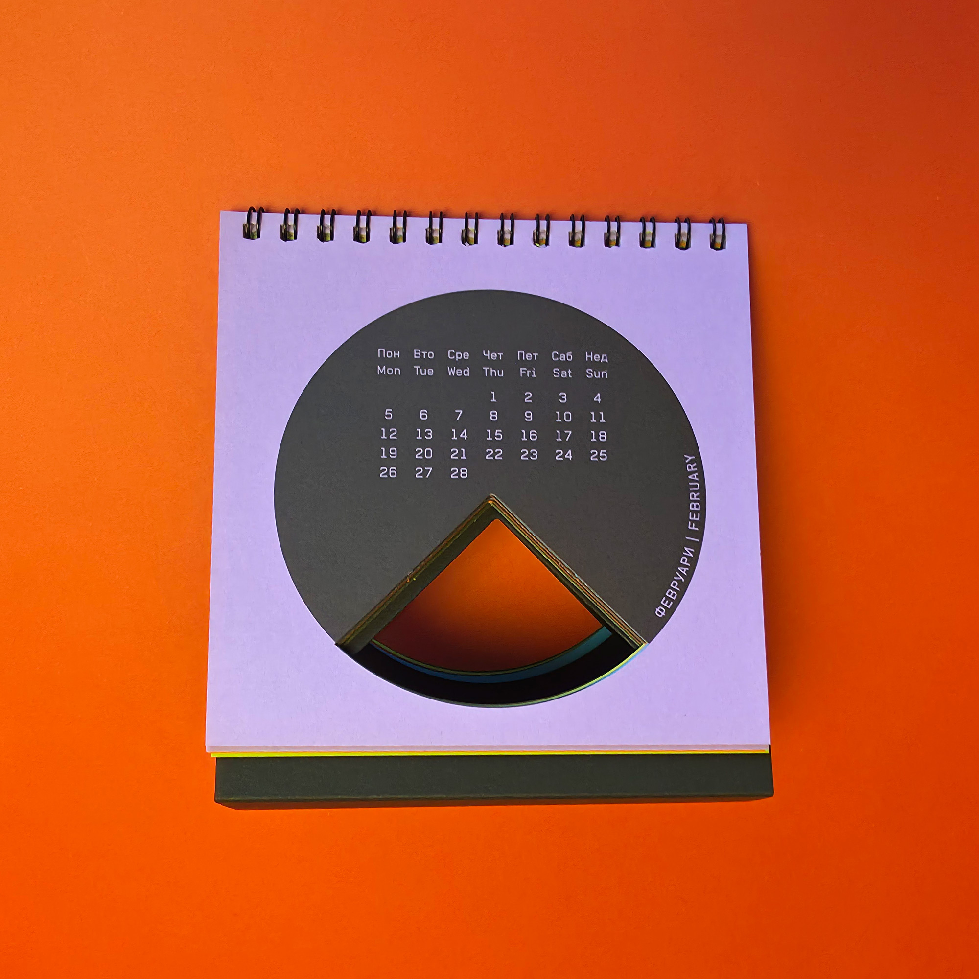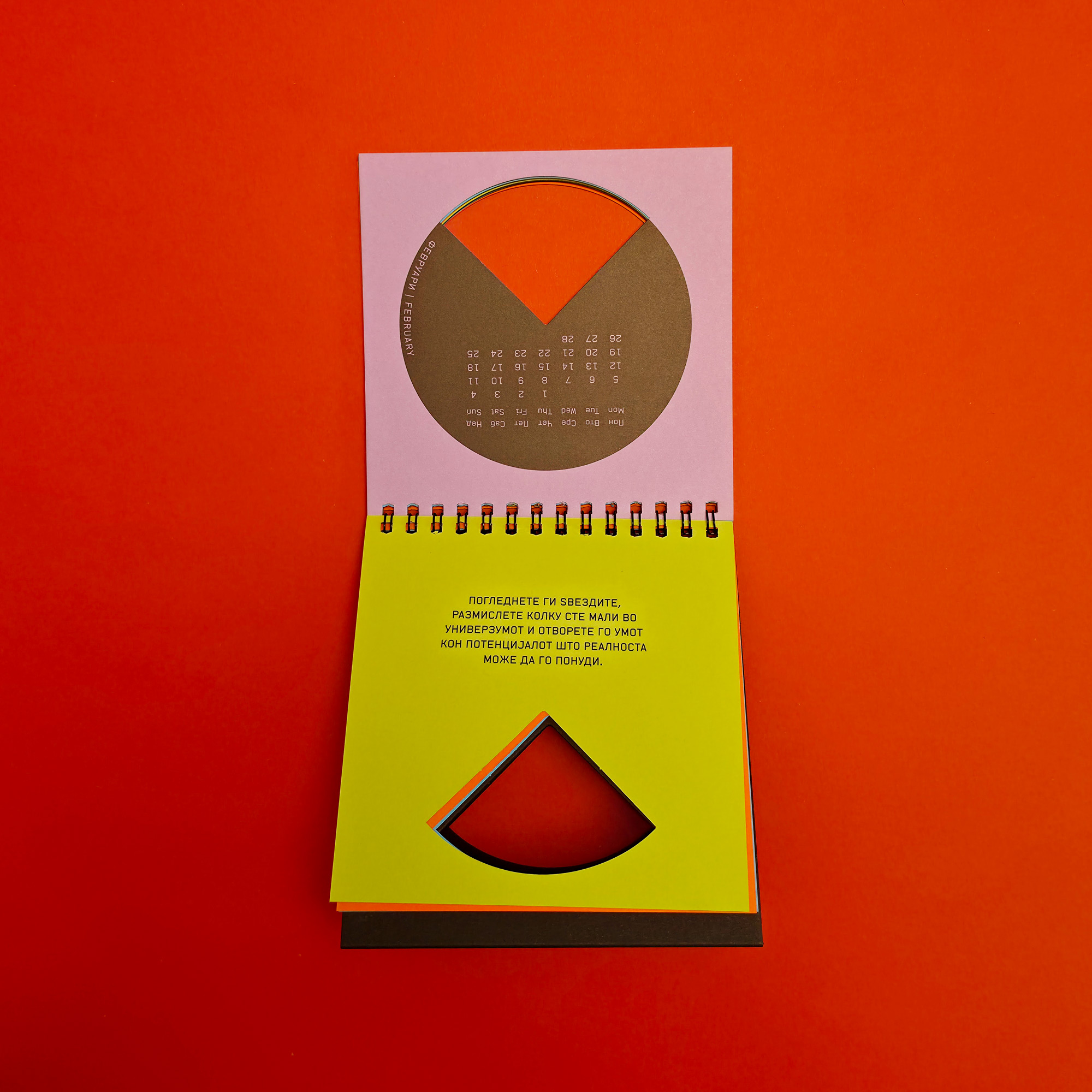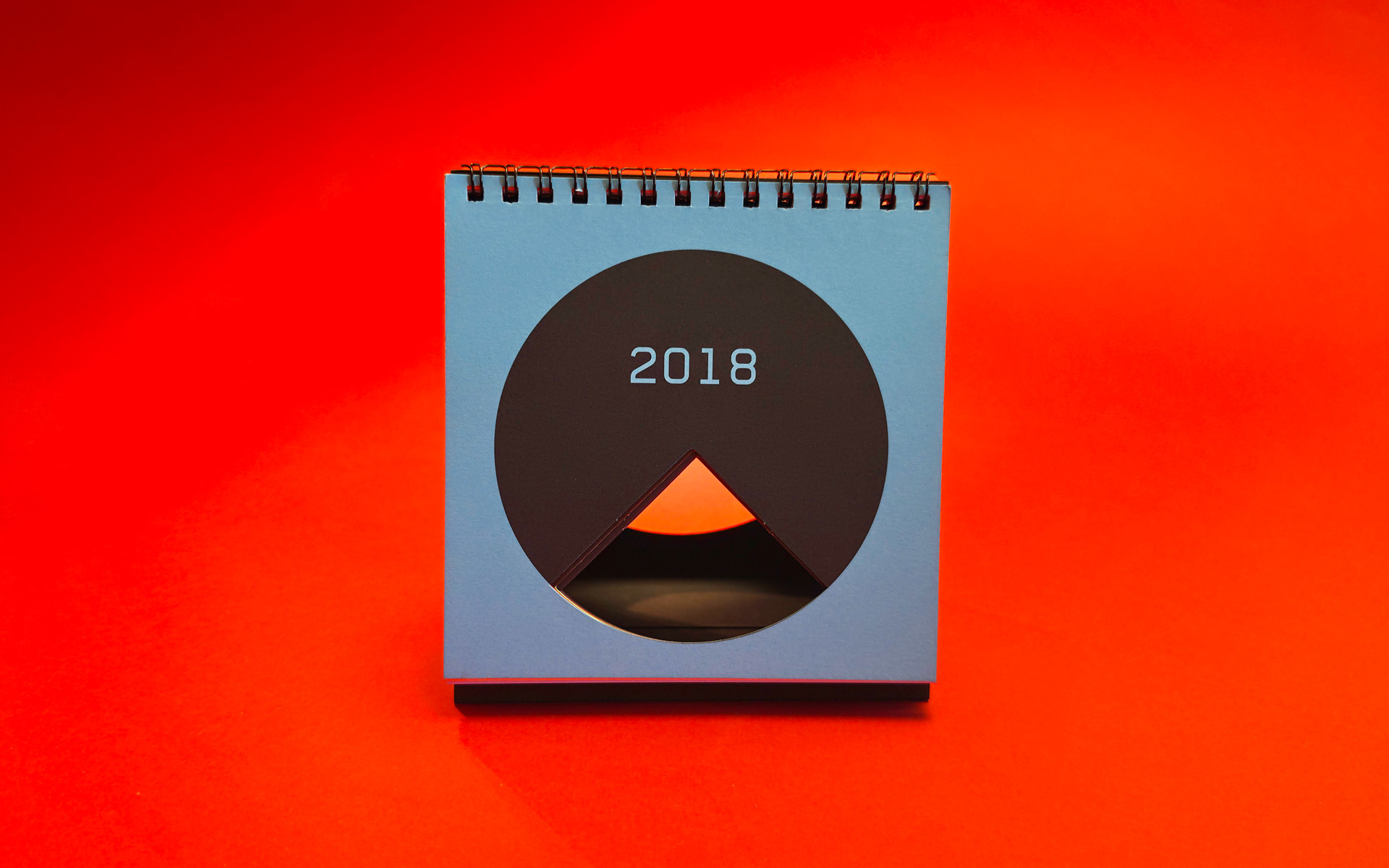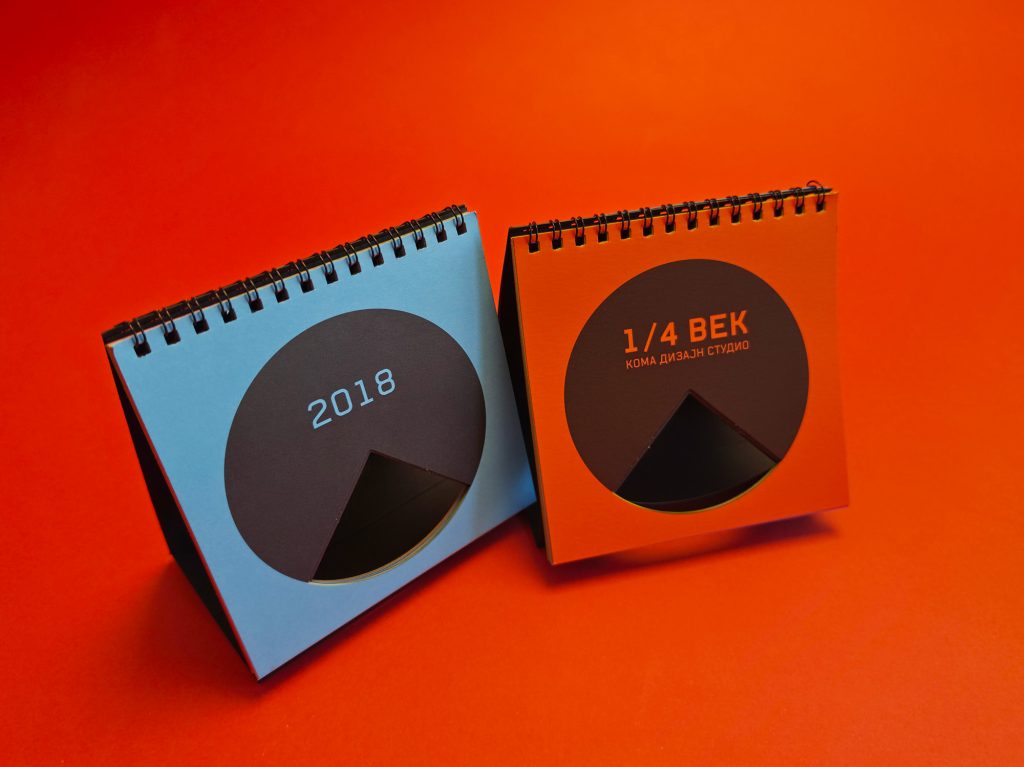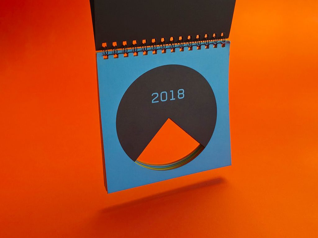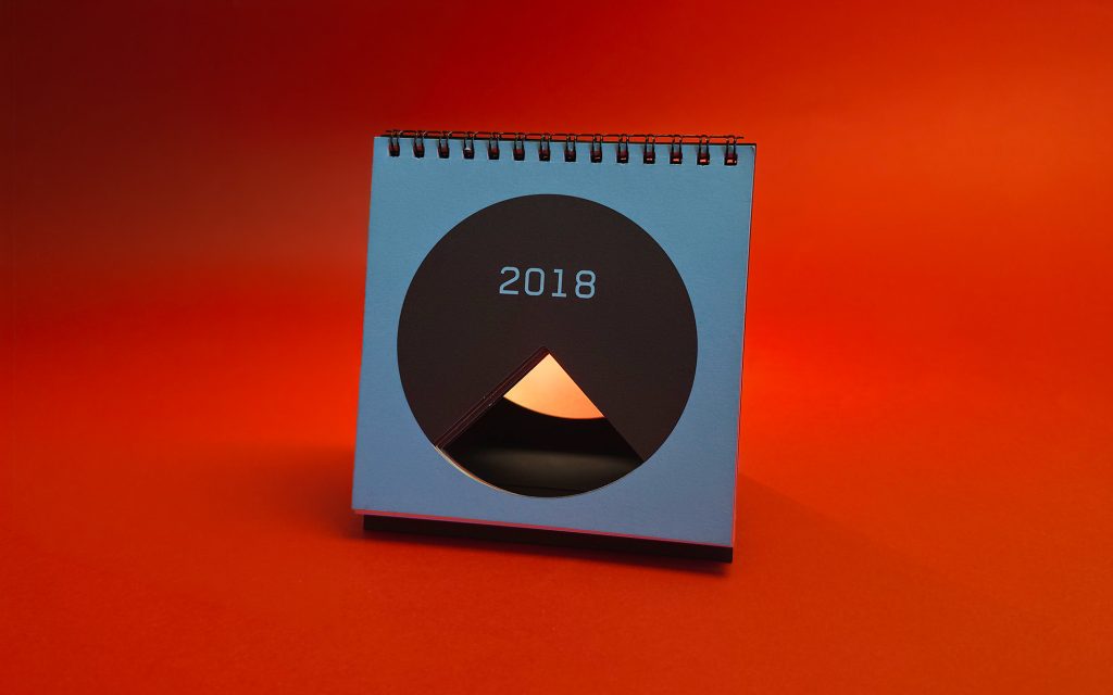 Marking 25 years of KOMA Design Studio, the 2018 calendar was built around the idea of a quarter century. Each page features a die-cut quarter of a circle, creating a continuous opening that runs through the entire calendar. The design embraced strict minimalism, using simple geometric logic and bold color surfaces to turn the physical object itself into the central visual gesture.