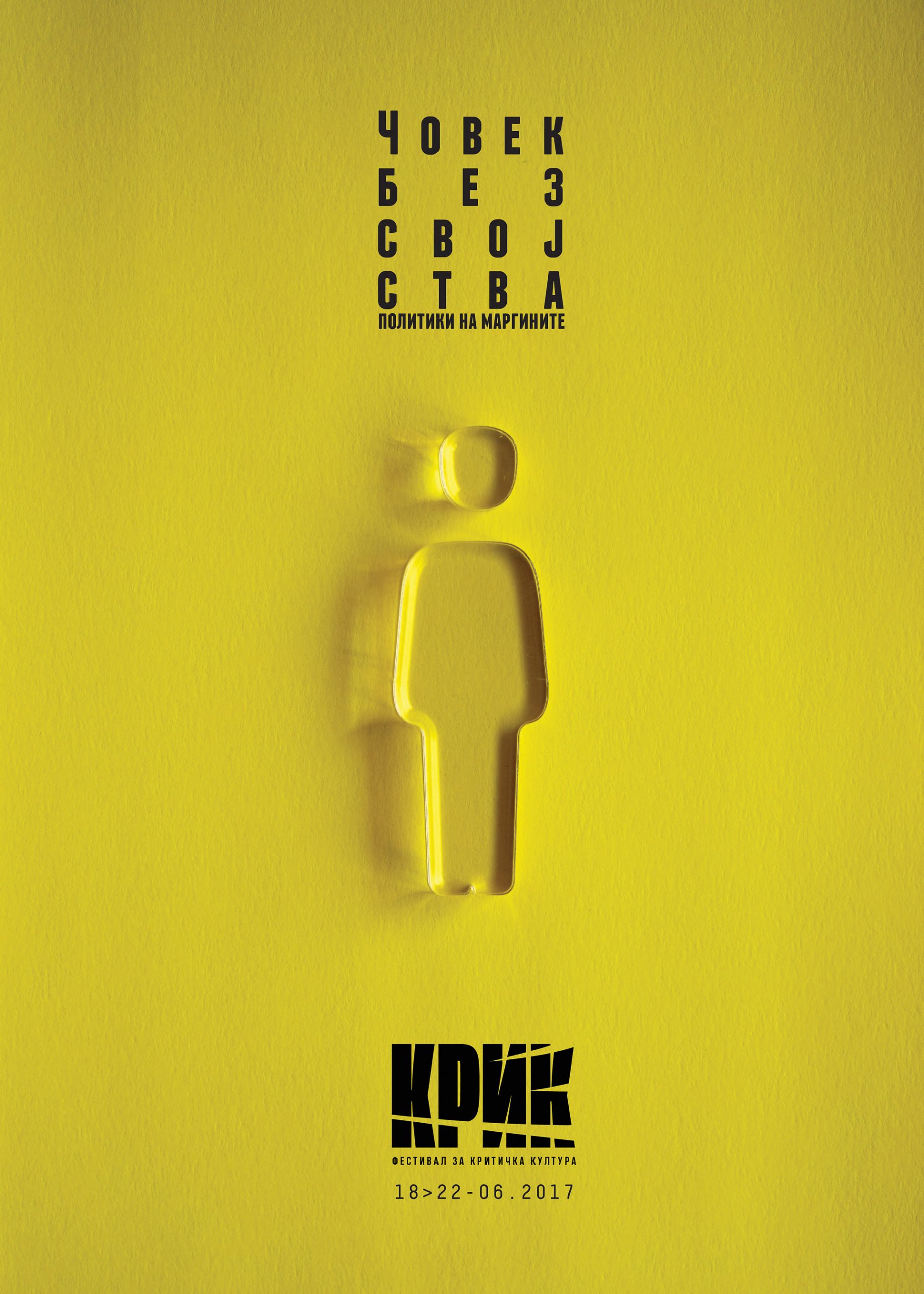Man Without Qualities – Politics of the Margins (2019) explores the condition of the contemporary subject gradually losing social, political, and cultural identity. The visual identity materialized this concept through a transparent human figure made of plexiglass, physically mounted onto posters and printed materials, making “absence” literally present.