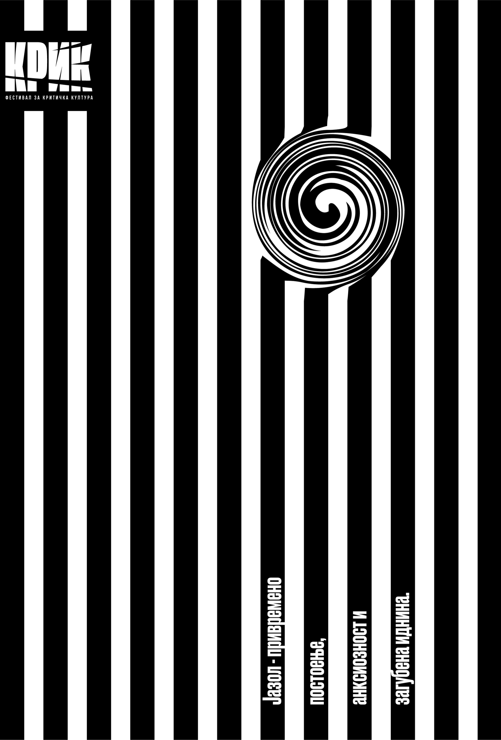 KRIK 2021, Knot — Temporary Existence, Anxiety and a Lost Future, examined the emotional strain of prolonged uncertainty. Black-and-white vertical stripes twist into a hypnotic spiral, forming a visual knot that symbolizes entanglement, pressure and the feeling of being trapped in unresolved time.