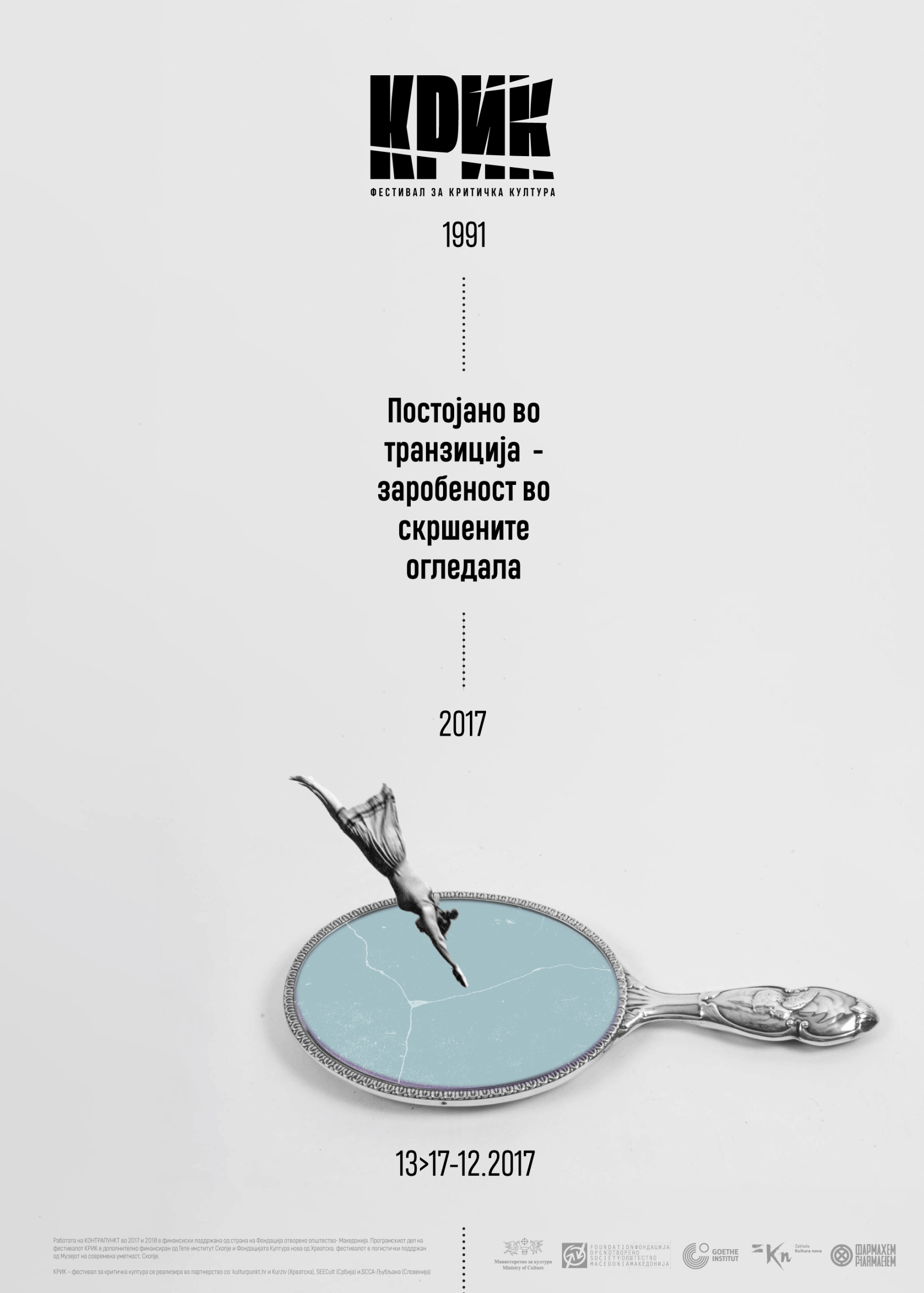 The 2017 edition of KRIK Festival for Critical Culture, titled Permanent Transition — Trapped in Broken Mirrors, explored the psychological and social condition of living in fragmented realities. The broken mirror becomes a central metaphor for distorted reflection, unstable identity and the uneasy space between memory and present time.