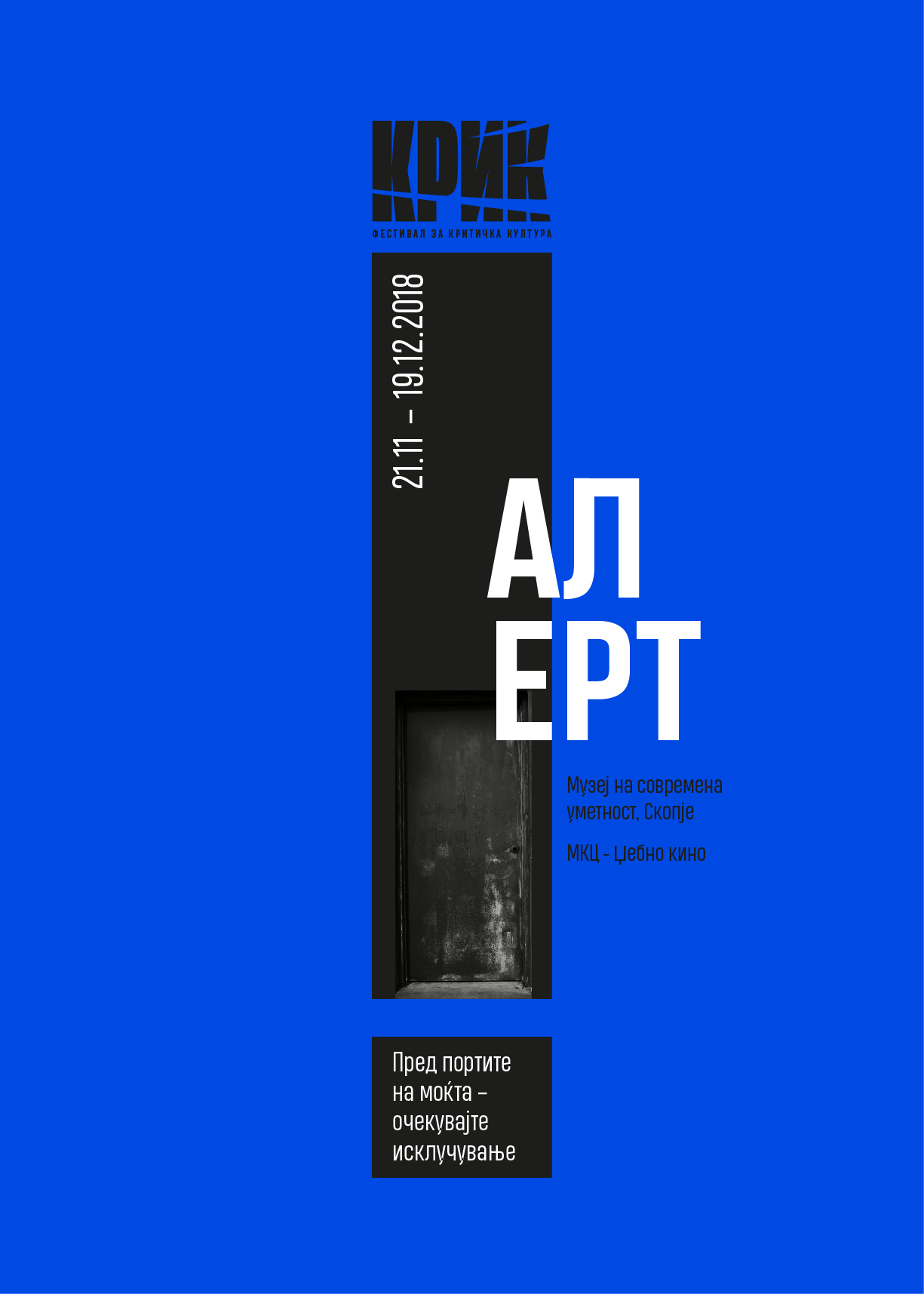 KRIK 2018, titled ALERT! — At the Gates of Power, Expect Exclusion, explored political exclusion as an architecture of controlled access. Drawing from Kafka’s Little Fable, the visual language evokes narrowing systems, sealed passages and the silent mechanics of institutional power.